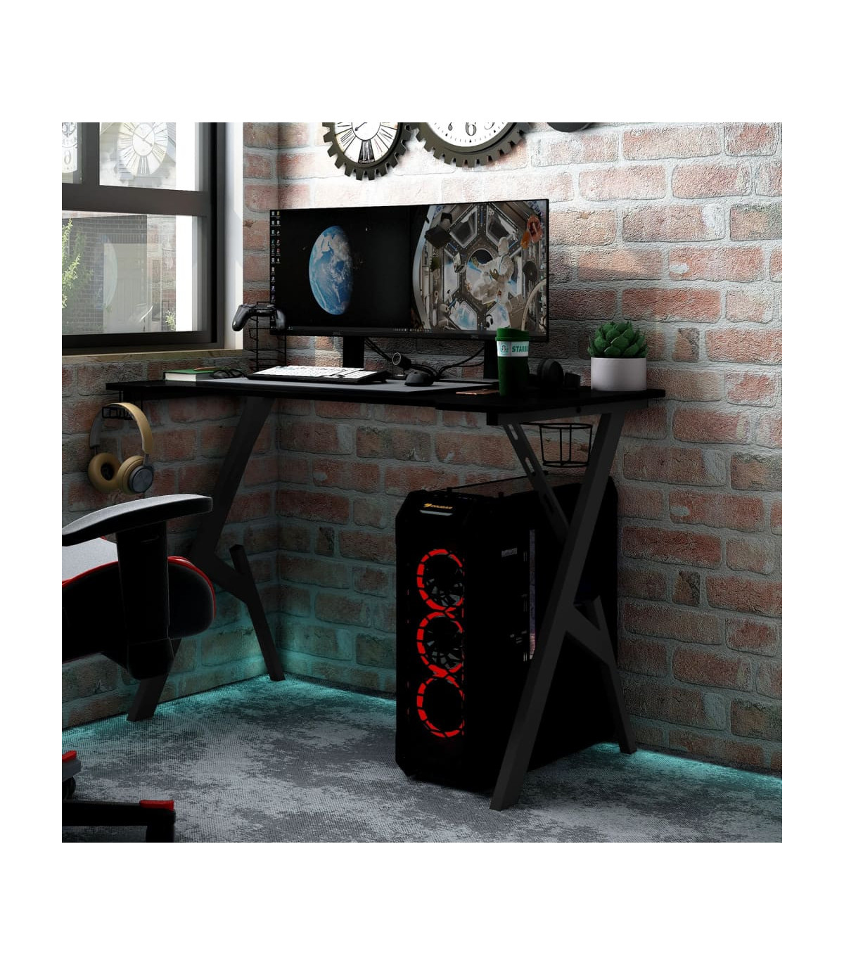 This gaming desk guarantees your concentration and comfort while playing or working. The streamlined ergonomic design offers a perfect gaming posture, helping you game longer and stronger! This computer desk includes an earphone rack and controller rack, which can hold your earphones right at your fingertips. It also has a cup holder to keep your drinks. It provides massive space for your gaming monitors, PC, gaming keyboards and other gaming gear. Additionally, the iron Y-shape leg design makes it stable and can stand up to any serious gamer??s demands.