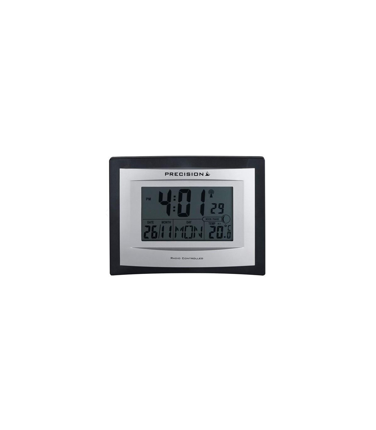 Precision silver table top clock with built-in stand option.Black number display.Digital display.12 hour clock.24 hour clock.Alarm.Snooze function.Calendar.Temperature display.Thermometer.Radio controlled time.Automatic time update. Room type (Bedroom, Living Room, Home Office) Rectangular Shape Clock. Radio Controlled Alarm Clock and Calendar UK USE ONLY Moon Phase Dispaly Indoor Temperature Dispaly Requires x 2 AA Size Batteries Dimensions W 23 X H 19 X D 3 CM Approx 2 Year Guarantee