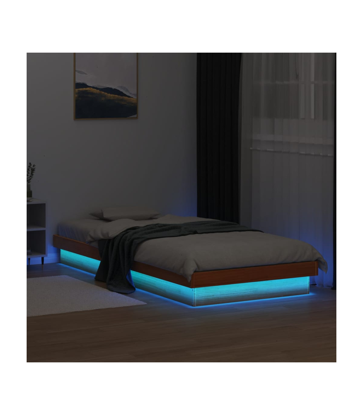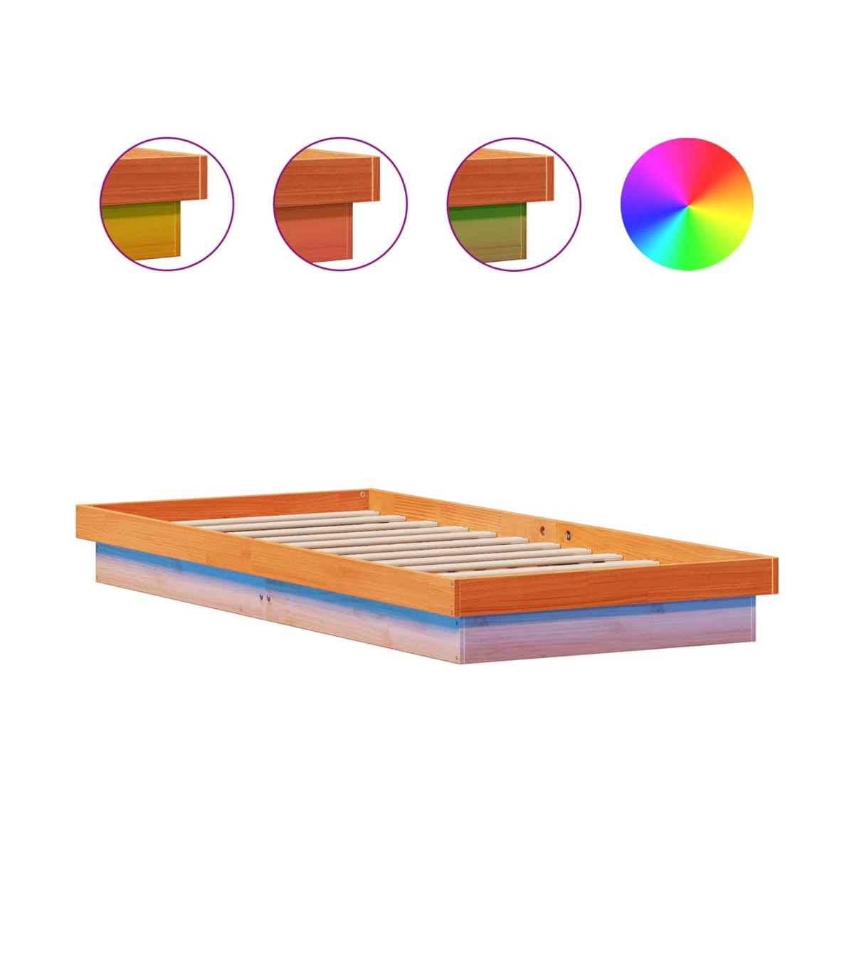 This classic bed frame with colourful LED lights is meant to become the focal point of your bedroom. Solid pine wood: Solid pine wood is a beautiful natural material. Pine wood has a straight grain, and the knots give the material its signature, rustic look.Sturdy and stable frame: The wooden frame ensures sturdiness and stability.Sturdy slats: The plywood slats provide good weight distribution, ensuring that the mattress stays in place with every twist and turn of your body during sleep.RGB LED lights: This wooden bed features RGB LED lights, which have different menus to change the colour of lights and let the colour adjust automatically. Good to know:A mattress is not included with this bed. We do offer a various selection of mattresses. You can check our shop for a matching mattress.The product has a USB connector that requires a certified 5V USB power source (not included).