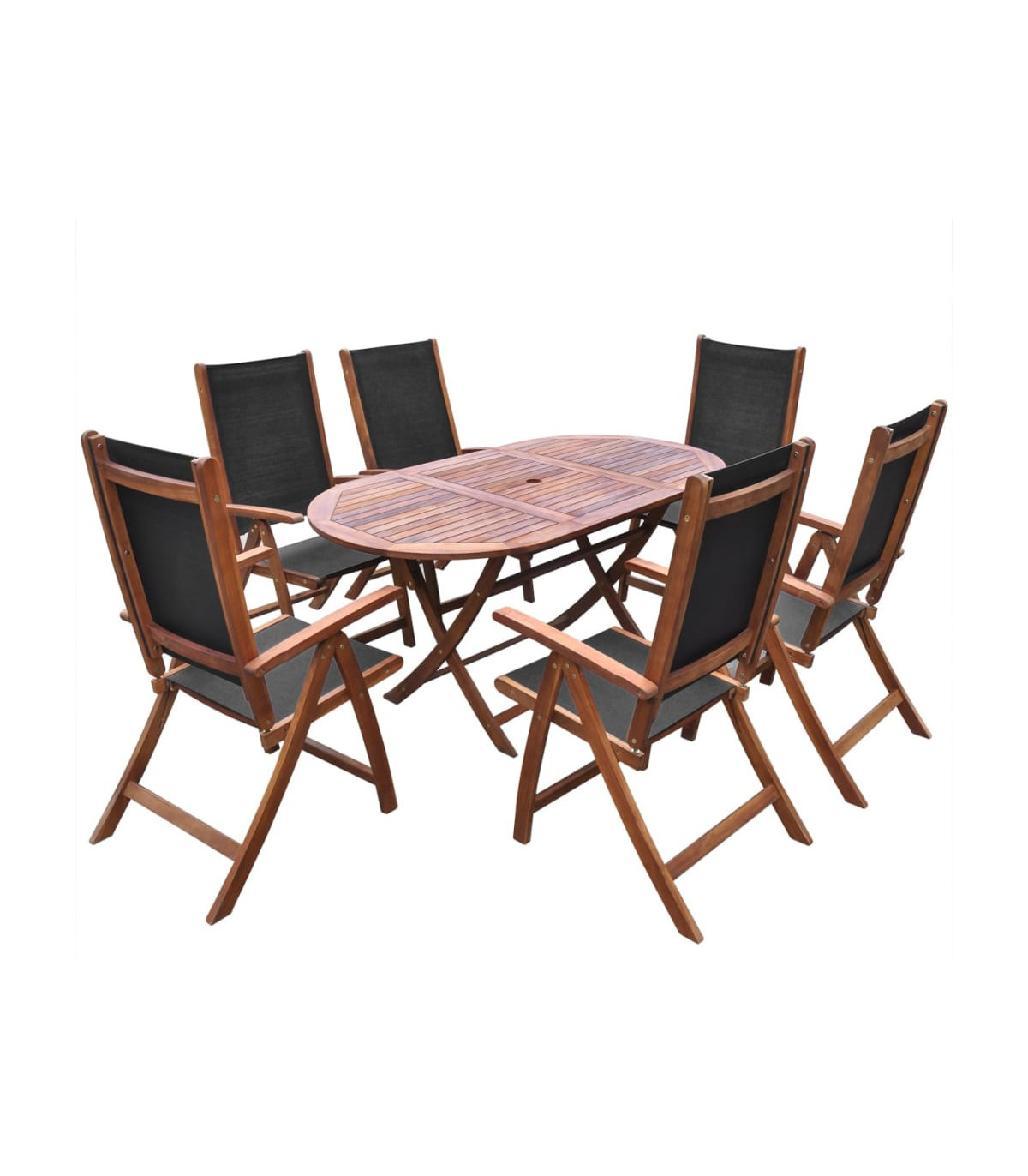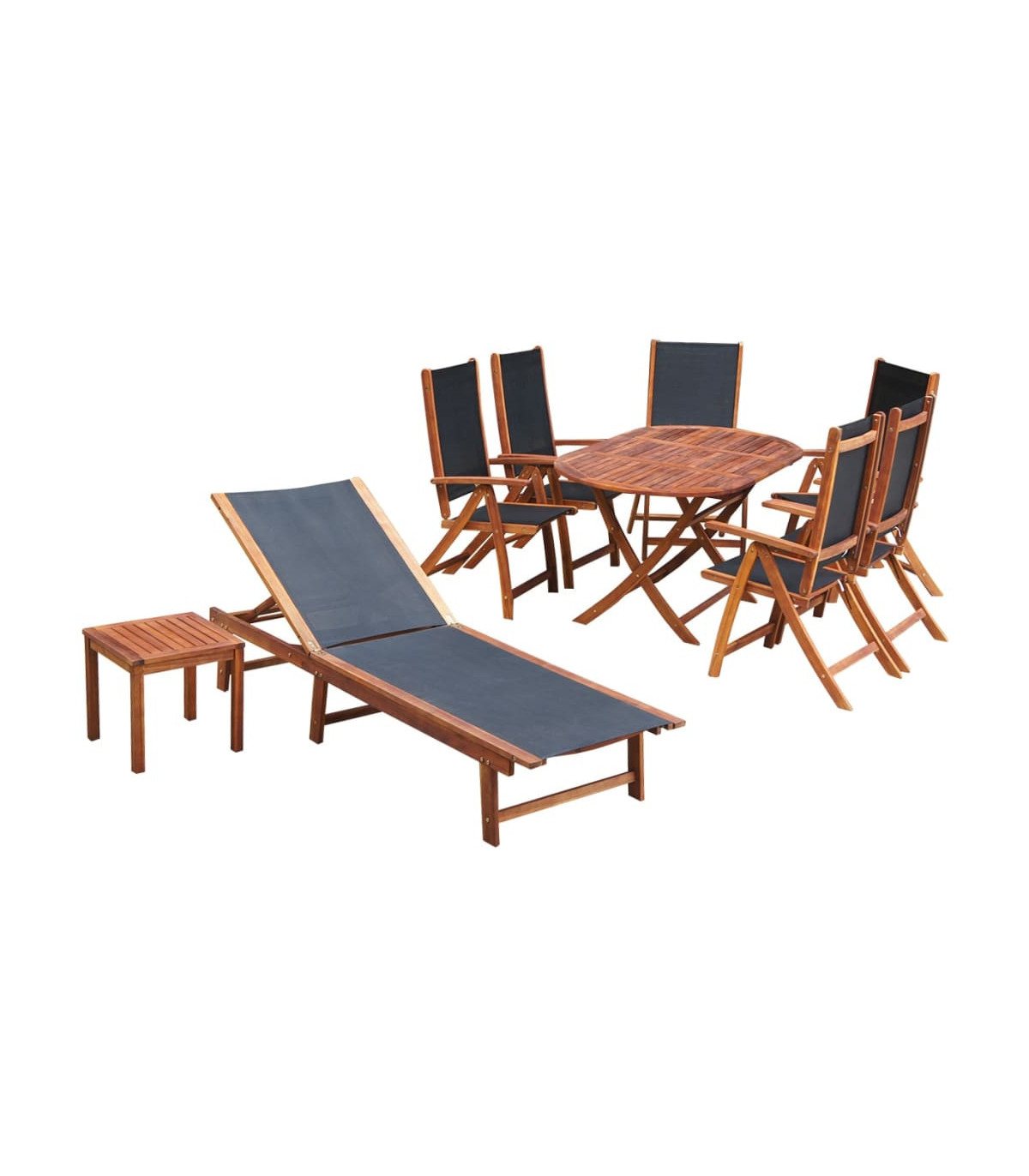 This stylish and contemporary outdoor wooden furniture set combines style and functionality, and will add a touch of rustic charm to your garden or other outdoor space. The dining table is made of high-quality acacia wood, a tropical hardwood, which is weather-resistant and durable. The dark oil finished surface is also easy to clean with a damp cloth. The chairs can be adjusted in 5 positions and have a smooth, soft-to-the-touch, weather-resistant Textilene top. The table and the chairs can be folded to save space when not in use. Finished with a light oil coating, the sun lounger is made of high-quality acacia wood, which is weather-resistant and highly durable. Thanks to the strong Textilene fabric, it is also waterproof and easy to clean. The backrest of the sun lounger can be adjusted so you can always find the most comfortable position. You can keep your drinks, phone, books or other small items within reach on the sturdy square table, which is also made of acacia wood. Delivery includes 1 oval table, 6 folding chairs, 1 sun lounger and 1 square table.