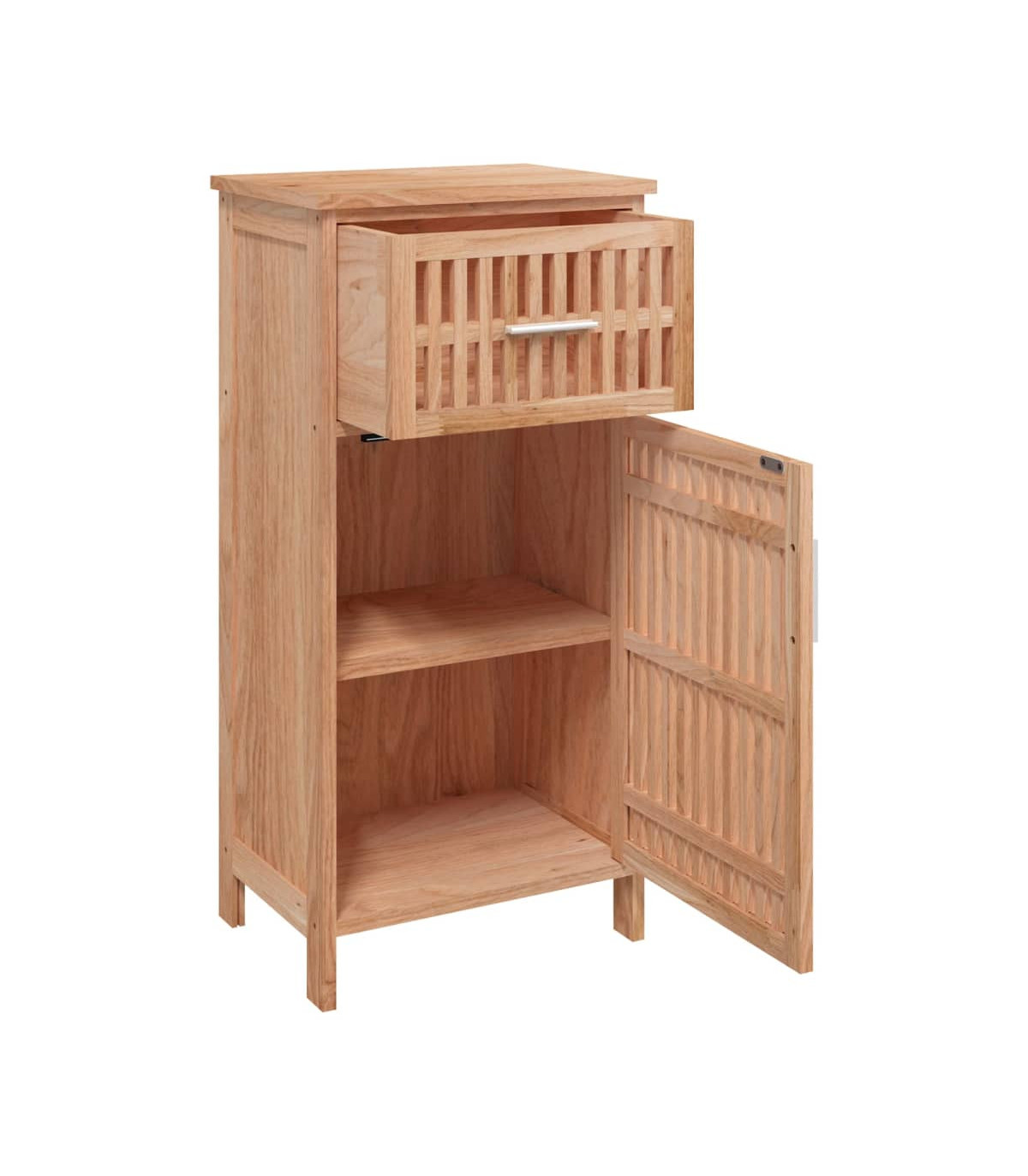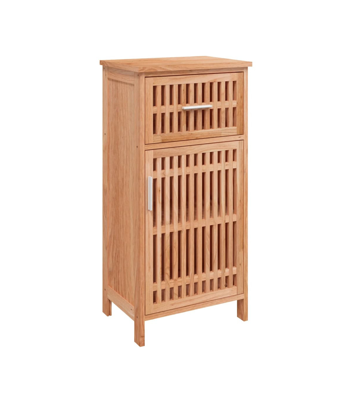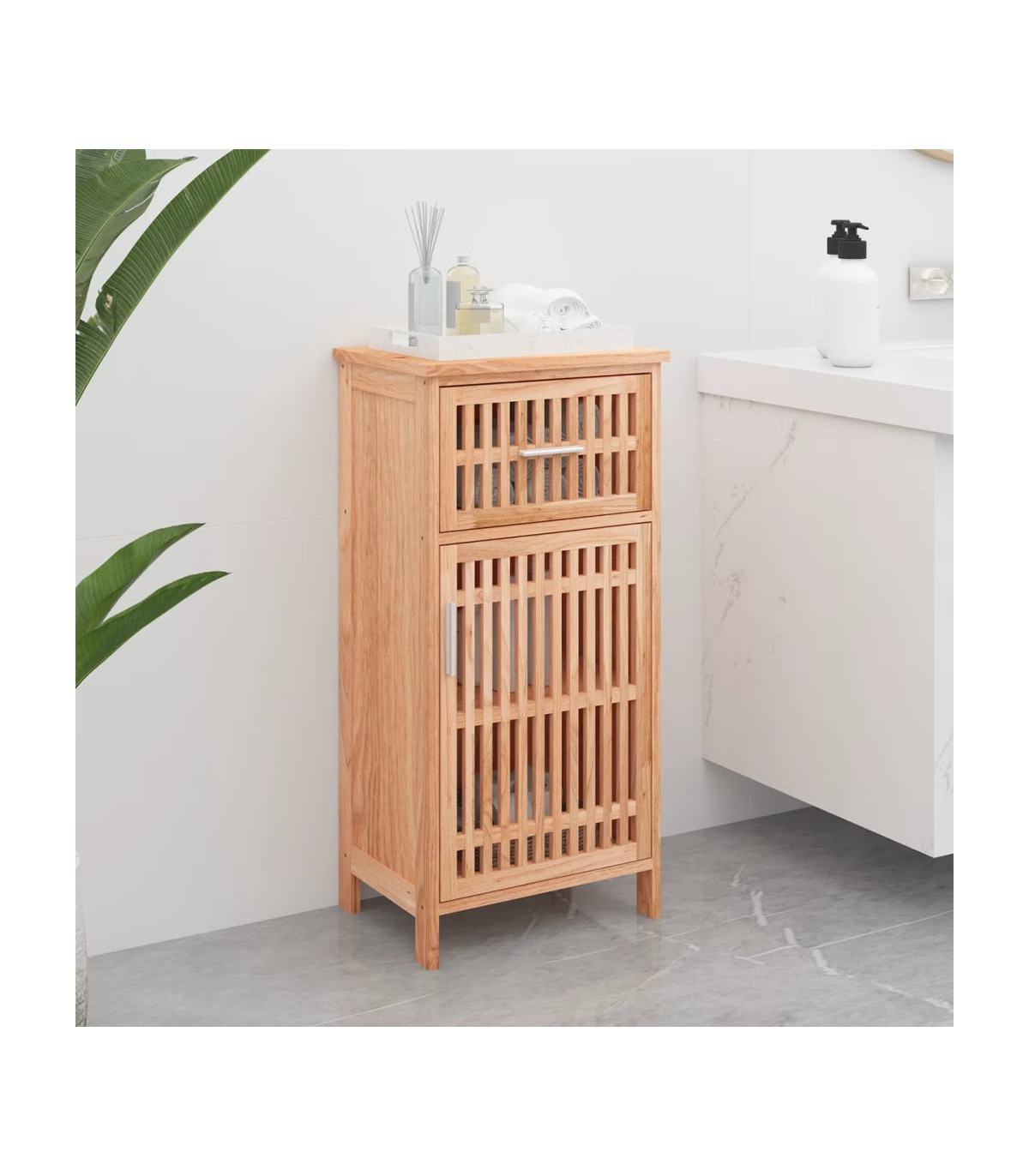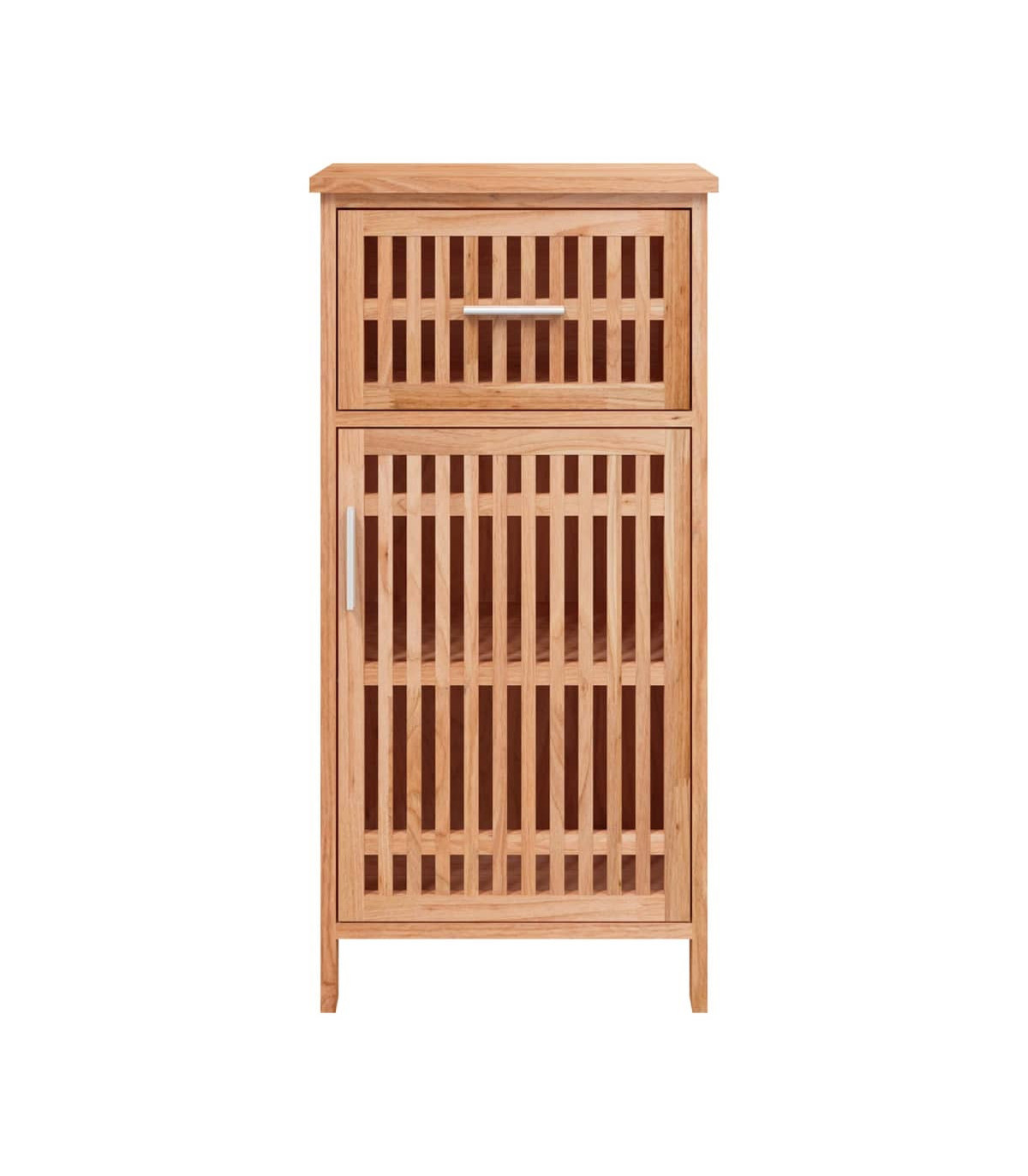 This bathroom cabinet, featuring spacious storage space, is a great addition to your bathroom, giving it a tidy and striking appearance! Solid walnut wood: Solid walnut wood is a dense and robust wood that is highly resistant to wear and tear, well known for its characteristic colour and attractive grain patterns.Ample storage space: The bathroom unit has 2 compartments and a drawer, providing ample storage space for keeping your daily essentials well organised.Practical door: Keep your space clutter-free by hiding small essentials behind the door of this bathroom cupboard.Great ventilation: The door and drawer of the toilet cabinet are designed with a lattice look, which guarantees optimal ventilation. Warning:In order to prevent overturning, this product must be used with the wall attachment device provided. Note:Each product comes with an assembly manual in the box for easy assembly.