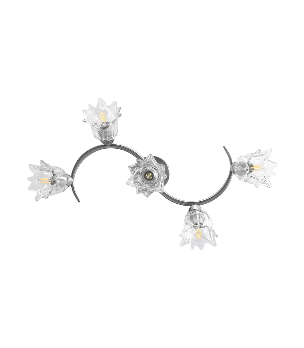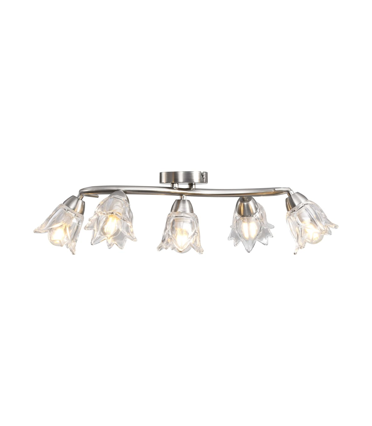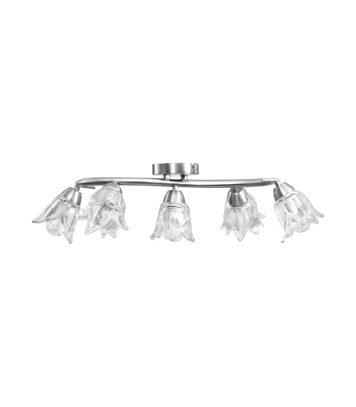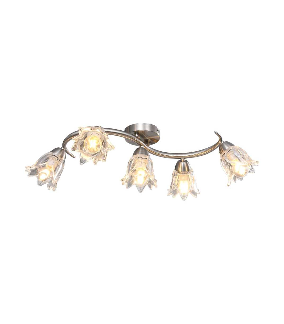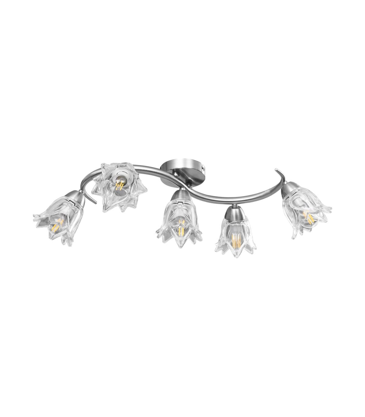 This exclusive ceiling lamp is guaranteed to be distinguished by its pleasing simplicity. This lamp can be easily mounted on any ceiling with a durable metal base. Five tangled chromed plated steel tubes and transparent glass tulip lampshades complete an elegant look. The satin chrome finishing gives this lamp a contemporary style, making it perfect for living room or bedroom with any style. It is also easy to maitain and clean with a damp cloth. This lamp can be assembled with ease.