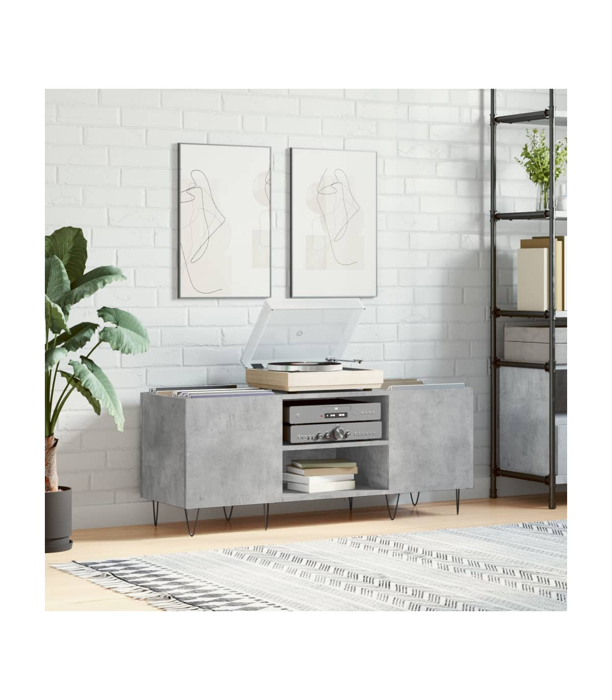 Store and show off your vinyl records with this practical and classic record cabinet. Durable material: The engineered wood is of exceptional quality with a smooth surface and features strength, stability, and resistance to moisture.Ample storage space: The spacious record player cabinet offers ample storage space for LP records and keeps your music collection well-organised.Sturdy top: The sturdy top of the vinyl storage cabinet is ideal for placing your record player or other electronics.Iron feet: The iron feet add an industrial style to your interior while ensuring stability.