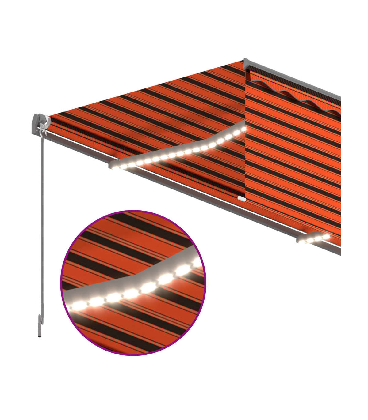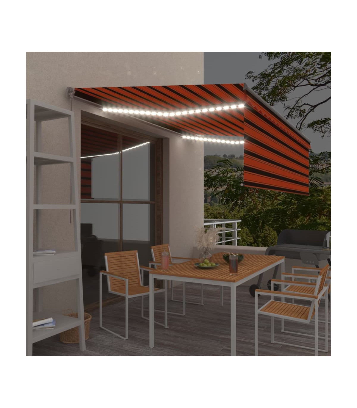 Create a lovely and cool place in your outdoor spaces with this retractable awning! This outdoor awning is built with a rust-resistant powder-coated aluminium frame, making it lightweight yet sturdy. The patio awning's fabric is made of high-density polyester with PU coating, which is UV and water-resistant. Additionally, the angle and height can be adjusted to meet your specific needs. You can open and retract the awning smoothly with the long hand crank. What's more, the solar-powered LED lights provide energy-saving lighting at night. The blind protects you from UV rays and offers privacy protection.