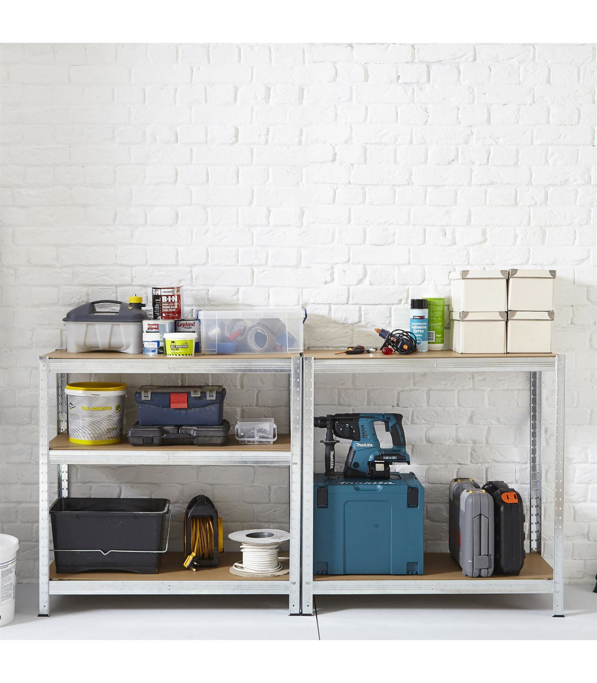 Heavy duty metal 5 Tier Racking Self is perfect for storage and organisation of stock in garages, sheds, workshops, warehouses, stock rooms, kitchens and shops. The racking unit is sturdy and durable. It features five solid MDF shelves which are adjustable. The shelving is versatile with moulded feet that can also be split to make two different units, a bench or a corner unit. Easy to assemble as no screws or bolts are used. Please note that each shelf has a maximum capacity of 175 Kgs.