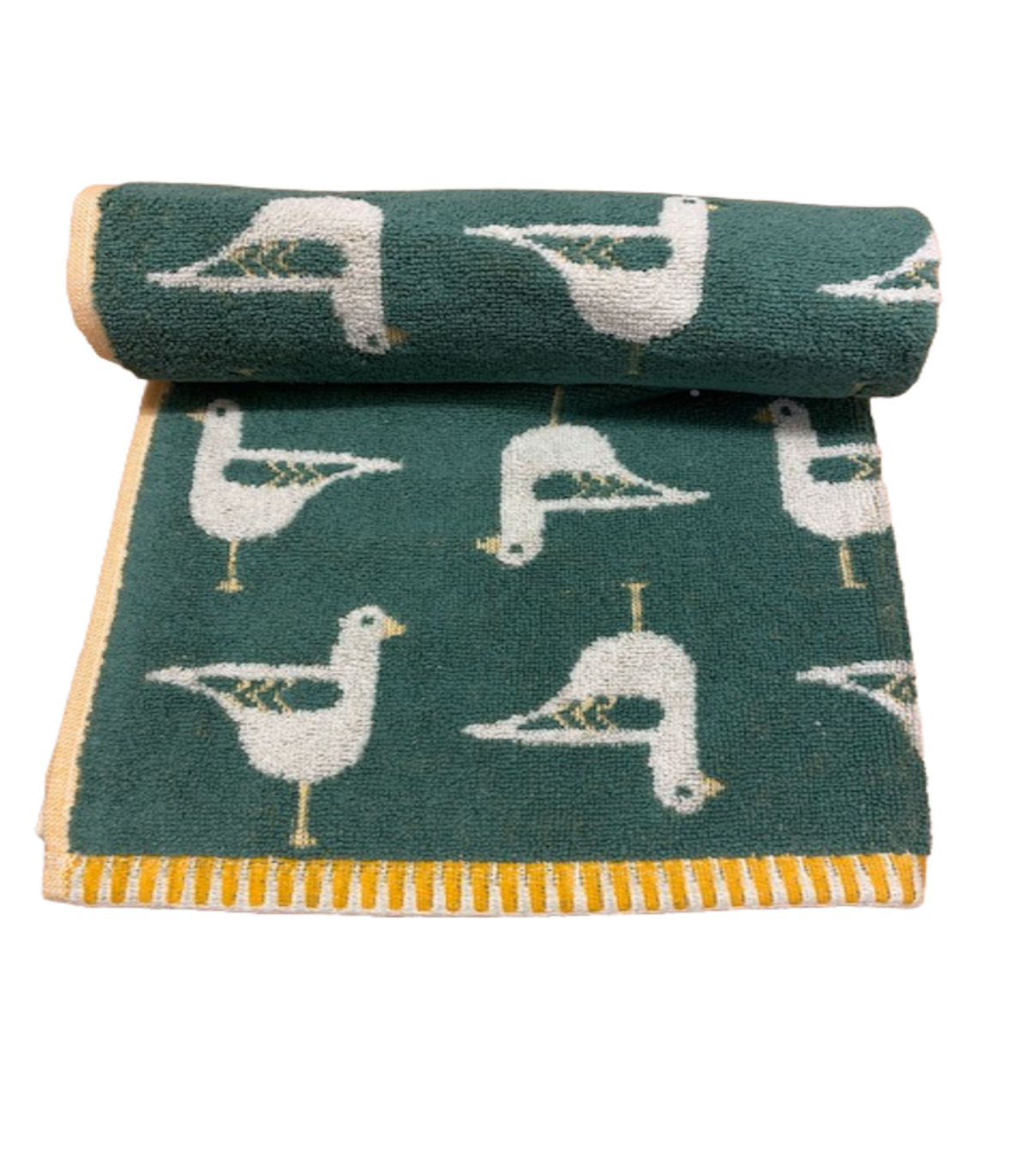A 100% Turkish cotton jacquard towel with a seagull design on a coloured background.