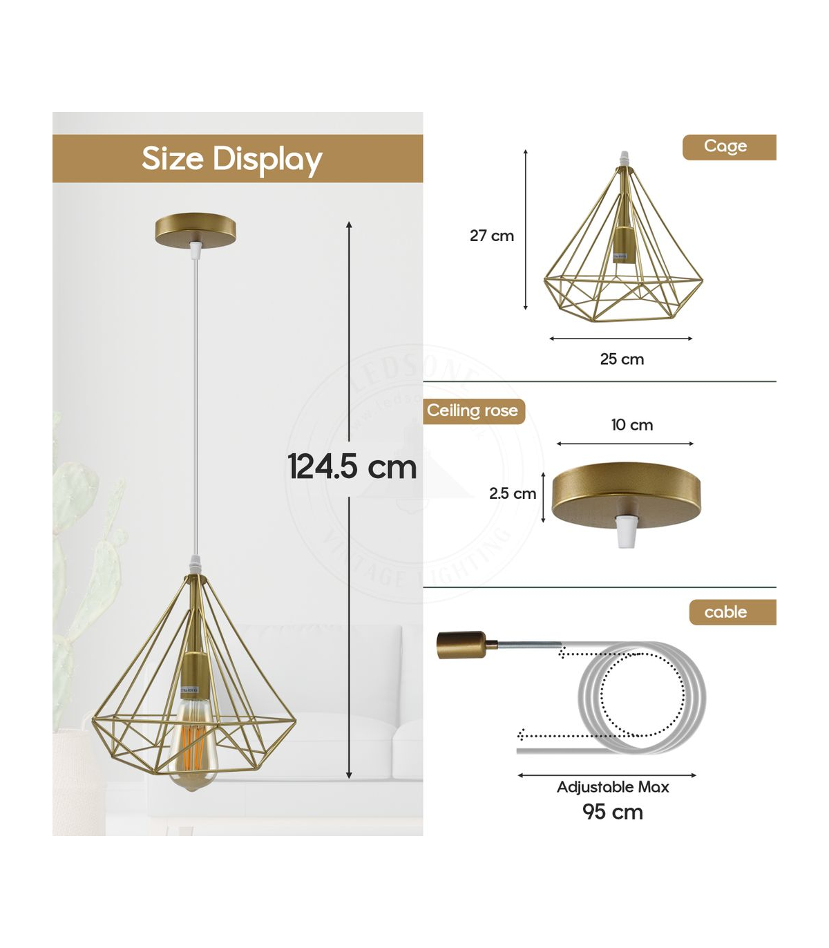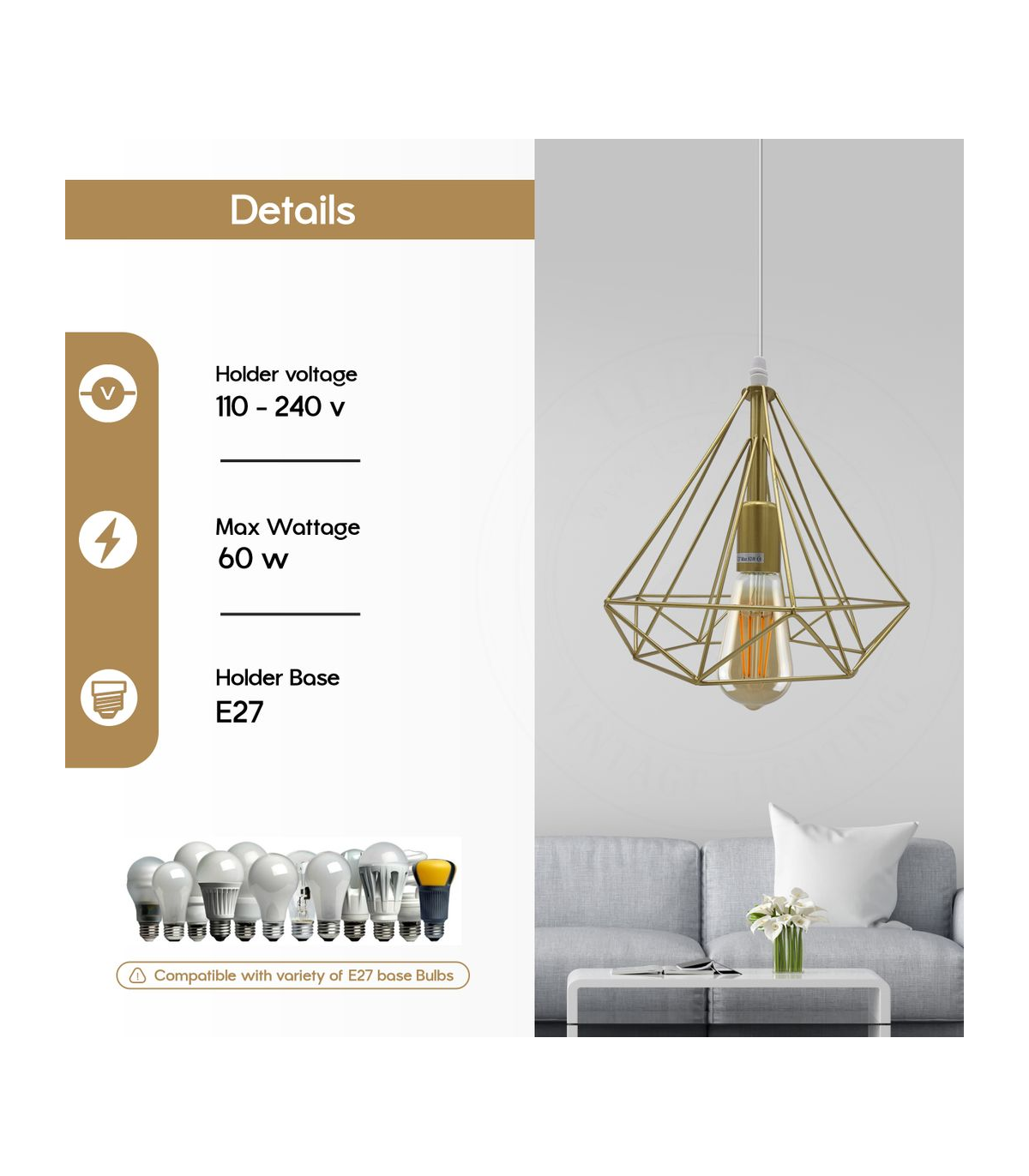 Feature: This simple, sleek pendant has unique finish for a vintage look. A gold electro plating on the holder of the hood enhances the illumination. It will be a perfect addition to your home decor and can be easily customized to your needs. E27 lamp base, you can choose any bulbs with the E27 interface as you want. Perfect to create a warm, romantic atmosphere for your home, restaurants, and cafes. CE certified, Also has 1wires-live wire, neutral wire and earth wire, ensuring safety. Item Specifications / Technical Details: Item Type: Pendant light Style: Vintage/Retro Voltage: AC110V-240V Material: Metal Bulb Requirements: Requires E27 max 60W Bulb Type: Compatible with all kinds of E27 bulbs Installation Area: Indoor Dimmable: Yes (required a dimmable bulb and dimmer switch) Energy consumption: A+ with LED bulbs. Package included: 1 x Ceiling rose with accessories. 3 x Pendant holder with cable. 3 x Light cage and fittings.