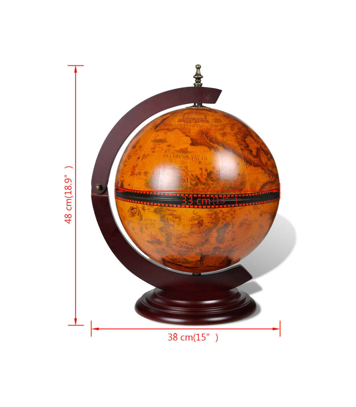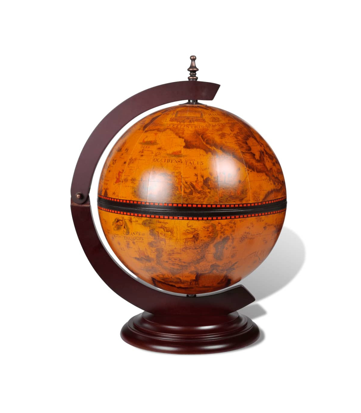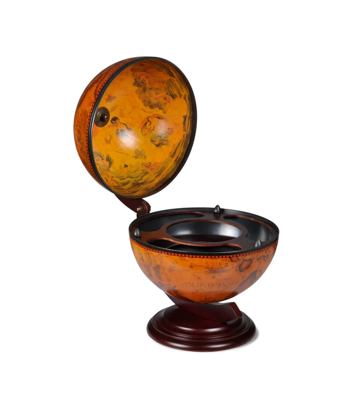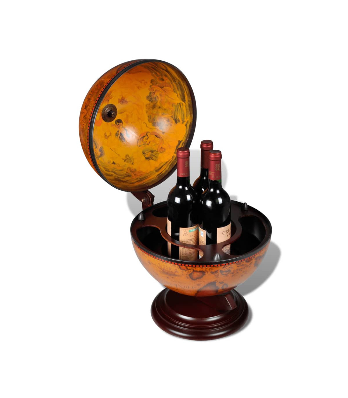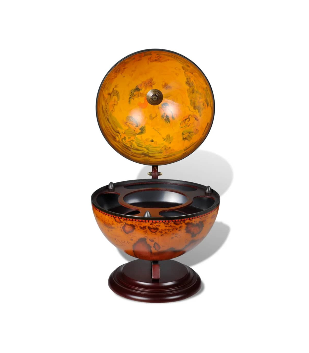 The wooden globe bar opens to reveal a large rotating bar with plenty of room for wine, spirits, beverage and stemware, thus you are able to display your wine and glasses in order in hidden space while ensuring easy access. The outside surface of the bar globe is wrapped with 16th century replica nautical maps, and the inside antique replica frescoes, making the bar globe a work of art and a good decoration for home or office. This globe bar is undoubtedly a perfect combination of storage and aesthetic functions.