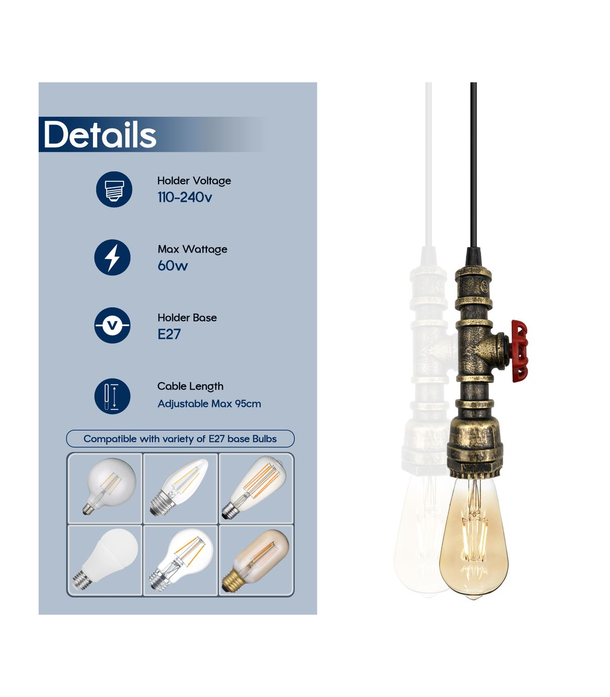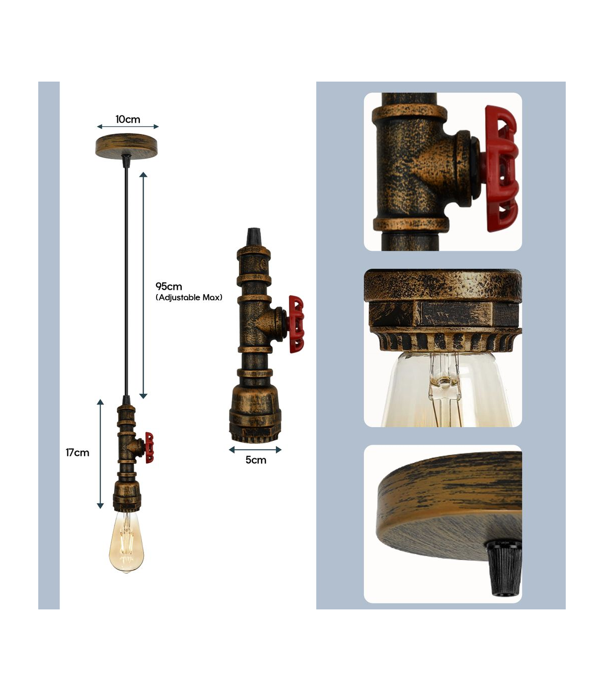 Features: This pendant lamp is made of metal and water pipe light which are high-quality materials. The strict factory processes will ensure the quality of the product in your hand. It includes colour ceiling rose perfect for fabric flex cable, 100mm Metal ceiling light fitting plate with accessories for ceiling pendent light. Designed with E27 lamp base, E27 standard bulb. Item Specifications / Technical Details: Product Name: Hanging pendant steampunk water pipe light Style: Vintage/Retro Voltage: AC110V-240V Lamp holder quantity: 1 Material: Metal and PVC Bulb Requirements: Requires E27 max 60W Bulb Type: Compatible with all kinds of E27 Bulbs Installation Area: Indoor Power Source: Hardwired Dimmable: Yes (required a dimmable bulb and dimmer switch) Wire length : 95cm Adjustable Cable Energy consumption: A+ with LED bulb Item included: 1x pipe holder with wire. 1 x Ceiling rose with accessories.