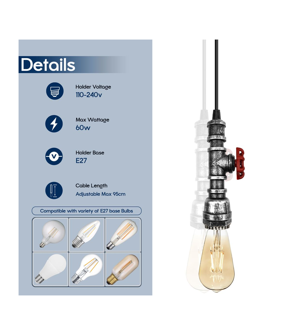 Features: This pendant lamp is made of metal and water pipe light which are high-quality materials. The strict factory processes will ensure the quality of the product in your hand. It includes colour ceiling rose perfect for fabric flex cable, 100mm Metal ceiling light fitting plate with accessories for ceiling pendent light. Designed with E27 lamp base, E27 standard bulb. Item Specifications / Technical Details: Product Name: Hanging pendant steampunk water pipe light Style: Vintage/Retro Voltage: AC110V-240V Lamp holder quantity: 1 Material: Metal and PVC Bulb Requirements: Requires E27 max 60W Bulb Type: Compatible with all kinds of E27 Bulbs Installation Area: Indoor Power Source: Hardwired Dimmable: Yes (required a dimmable bulb and dimmer switch) Wire length : 95cm Adjustable Cable Energy consumption: A+ with LED bulb Item included: 1x pipe holder with wire. 1 x Ceiling rose with accessories.