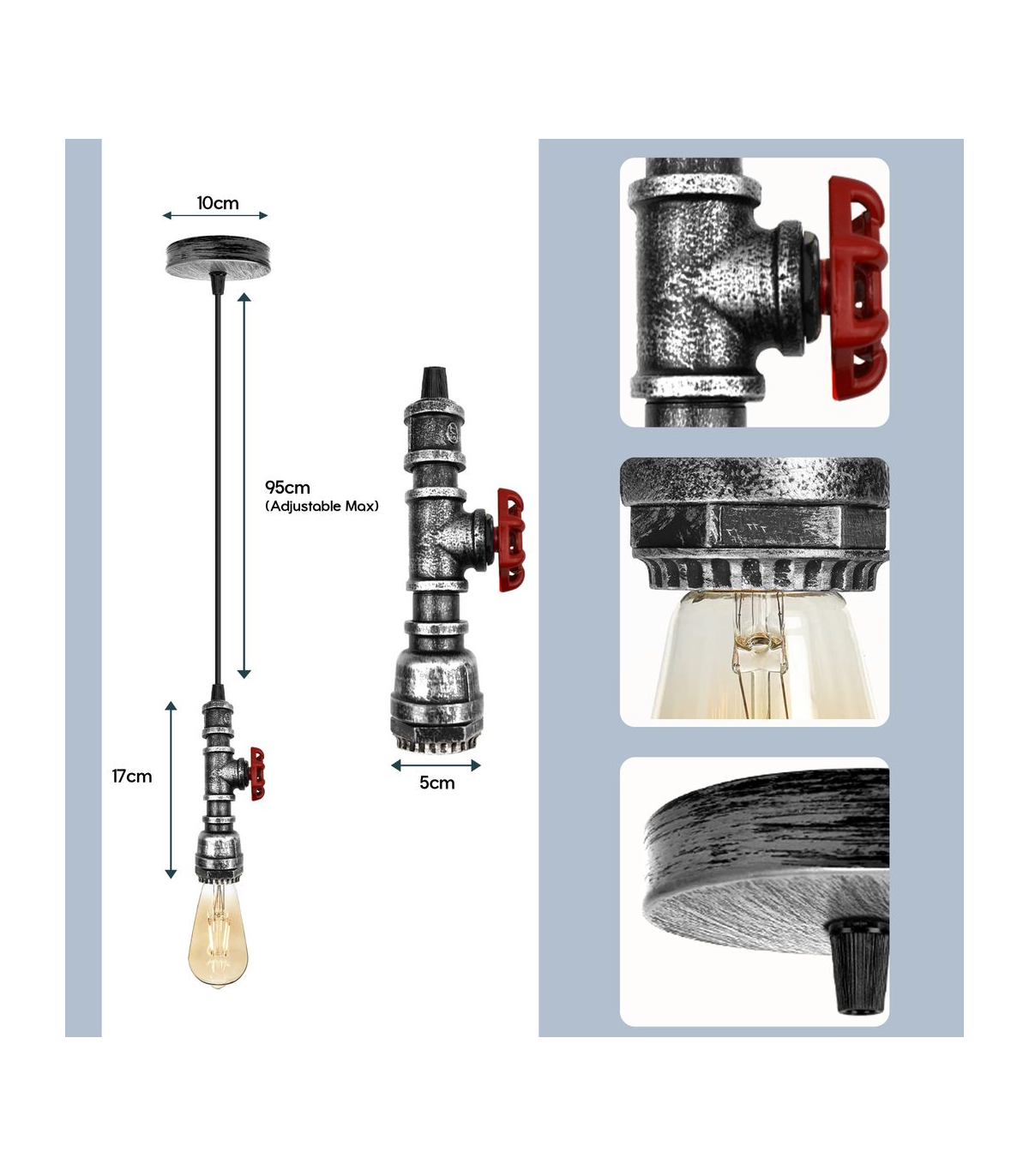 Features: This pendant lamp is made of metal and water pipe light which are high-quality materials. The strict factory processes will ensure the quality of the product in your hand. It includes colour ceiling rose perfect for fabric flex cable, 100mm Metal ceiling light fitting plate with accessories for ceiling pendent light. Designed with E27 lamp base, E27 standard bulb. Item Specifications / Technical Details: Product Name: Hanging pendant steampunk water pipe light Style: Vintage/Retro Voltage: AC110V-240V Lamp holder quantity: 1 Material: Metal and PVC Bulb Requirements: Requires E27 max 60W Bulb Type: Compatible with all kinds of E27 Bulbs Installation Area: Indoor Power Source: Hardwired Dimmable: Yes (required a dimmable bulb and dimmer switch) Wire length : 95cm Adjustable Cable Energy consumption: A+ with LED bulb Item included: 1x pipe holder with wire. 1 x Ceiling rose with accessories.