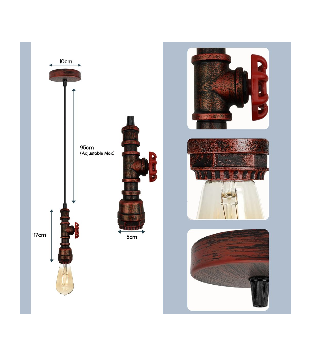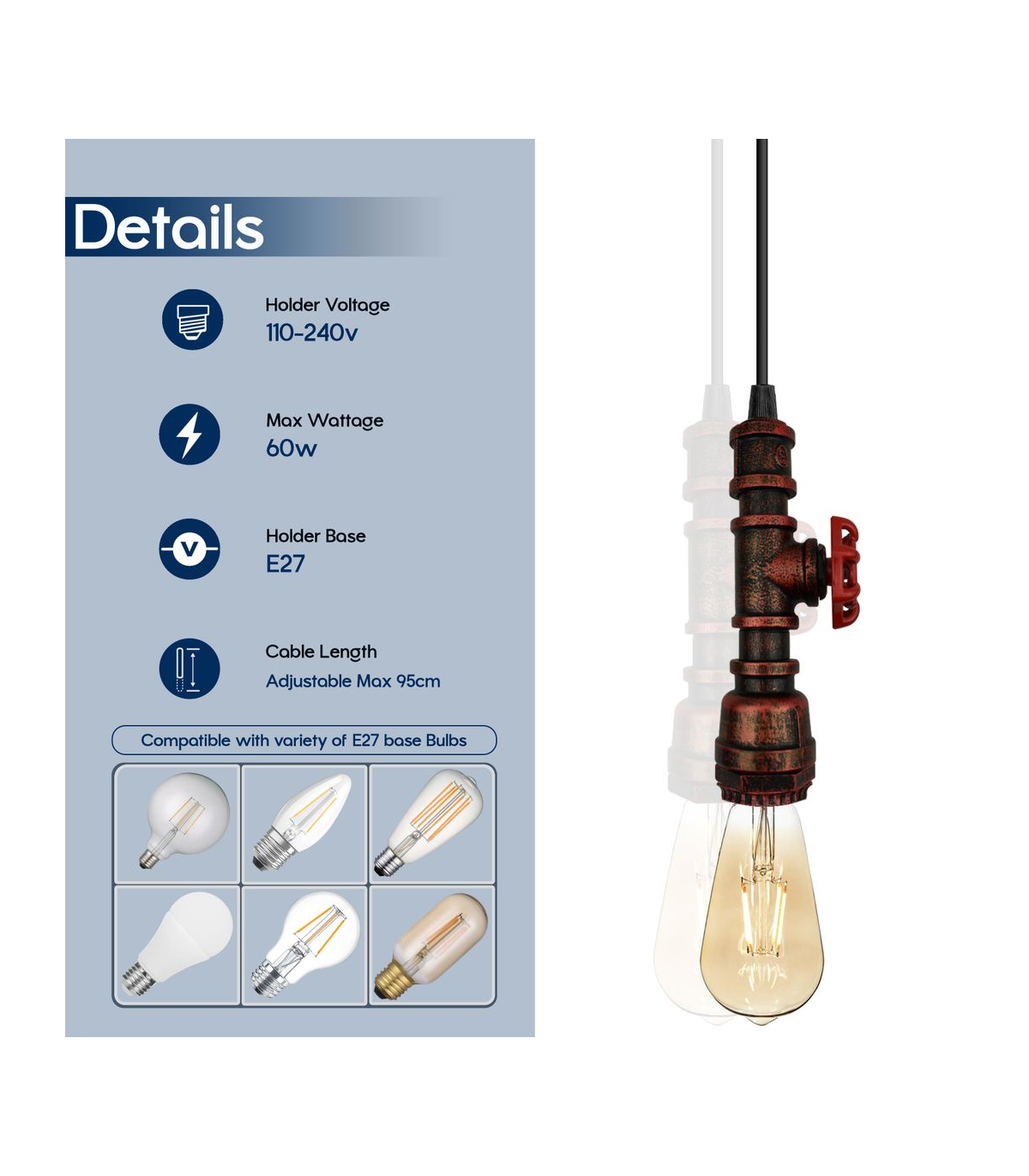 Features: This pendant lamp is made of metal and water pipe light which are high-quality materials. The strict factory processes will ensure the quality of the product in your hand. It includes colour ceiling rose perfect for fabric flex cable, 100mm Metal ceiling light fitting plate with accessories for ceiling pendent light. Designed with E27 lamp base, E27 standard bulb. Item Specifications / Technical Details: Product Name: Hanging pendant steampunk water pipe light Style: Vintage/Retro Voltage: AC110V-240V Lamp holder quantity: 1 Material: Metal and PVC Bulb Requirements: Requires E27 max 60W Bulb Type: Compatible with all kinds of E27 Bulbs Installation Area: Indoor Power Source: Hardwired Dimmable: Yes (required a dimmable bulb and dimmer switch) Wire length : 95cm Adjustable Cable Energy consumption: A+ with LED bulb Item included: 1x pipe holder with wire. 1 x Ceiling rose with accessories.