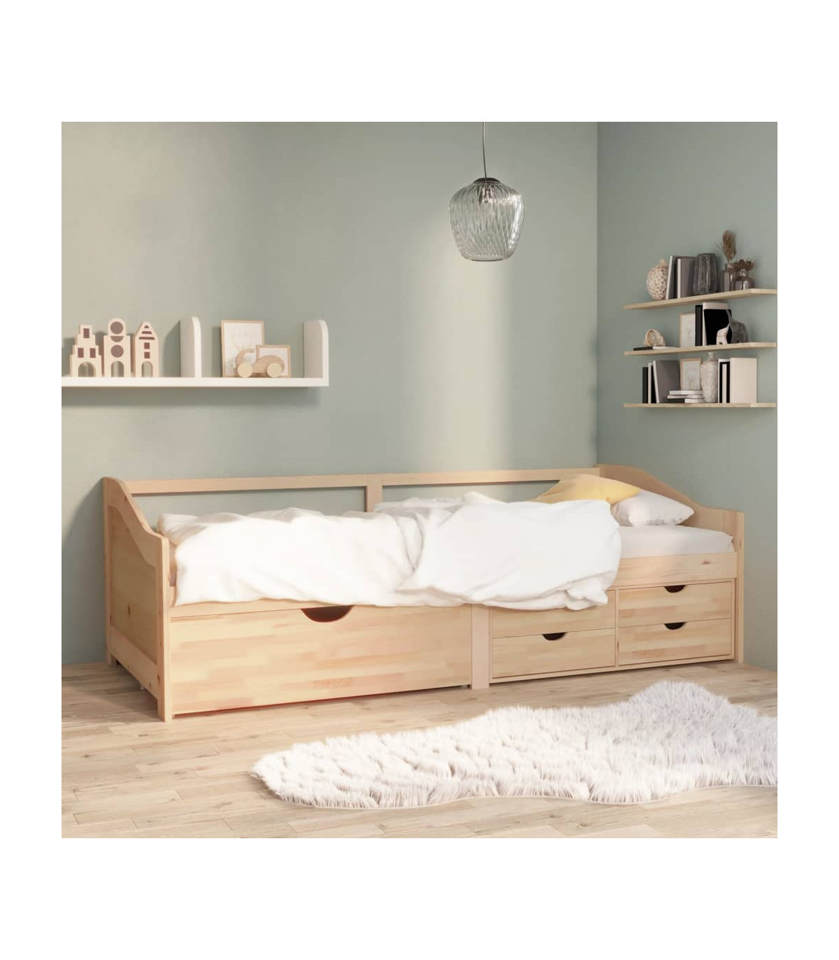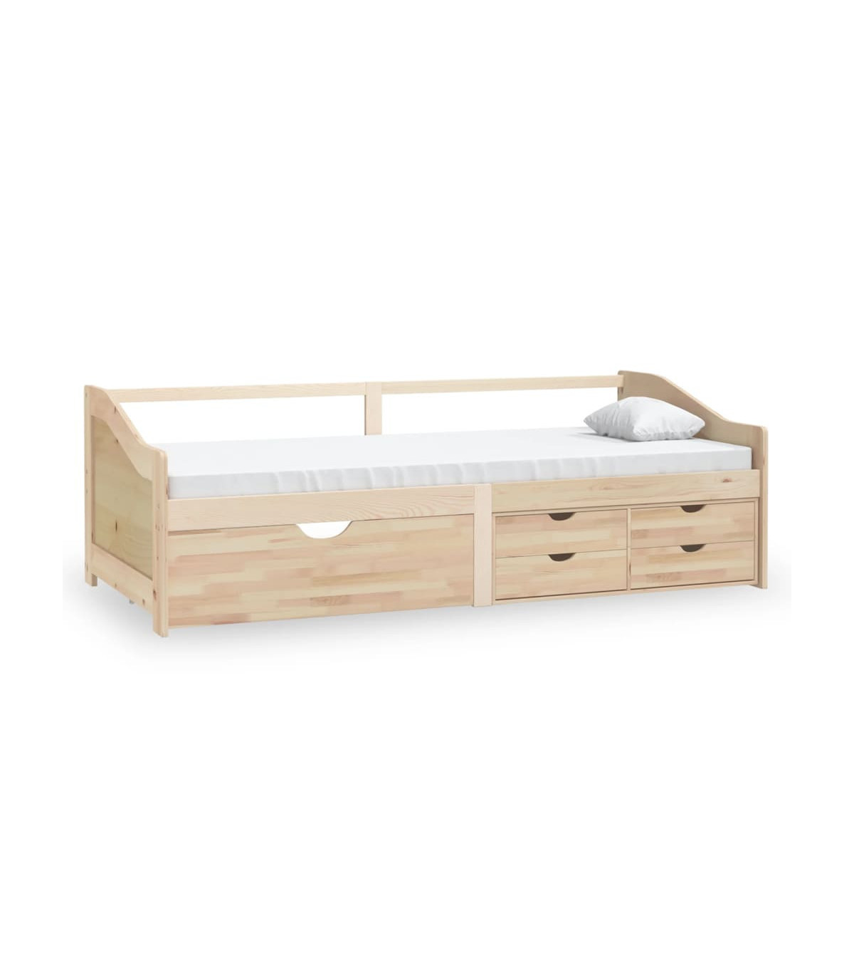 This multifunctional wooden day bed can be used as a sofa during the day, or as a bed at night to offer a quick solution to accommodate overnight guests. This practical sofa bed is definitely an eye-catcher wherever it goes! The sofa bed is made of solid pinewood, making it sturdy and stable. The sturdy slats also offer the needed support and comfort. Additionally, it also includes 5 bed drawers for storing folded clothes, toys, etc. Please note: The delivery includes a daybed frame only. The mattress is not included. You can check our shop for the matching mattresses.