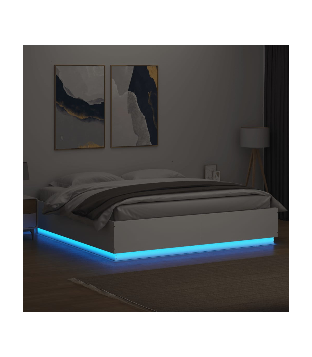 Get a better restful night's sleep from this bed frame with LED lights! It makes a welcoming addition to any bedroom. Durable material: The engineered wood is of exceptional quality with smooth surface and also features strength, stability and resistance to moisture.RGB LED lights: The bed frame is equipped with vibrant RGB LED lights. With various customisable menus, you can effortlessly change the colour of the lights and even set them to adjust automatically. These LED lights not only enhance the contemporary look of the bed base but also add to its trendy appeal.Sturdy slats: The plywood slats provide good weight distribution, ensuring that the mattress stays in place with every twist and turn of your body during sleep. Good to know:A mattress is not included with this bed. We do offer a various selection of mattresses. You can check our shop for a matching mattress.The product has a USB connector that requires a certified 5V USB power source (not included).