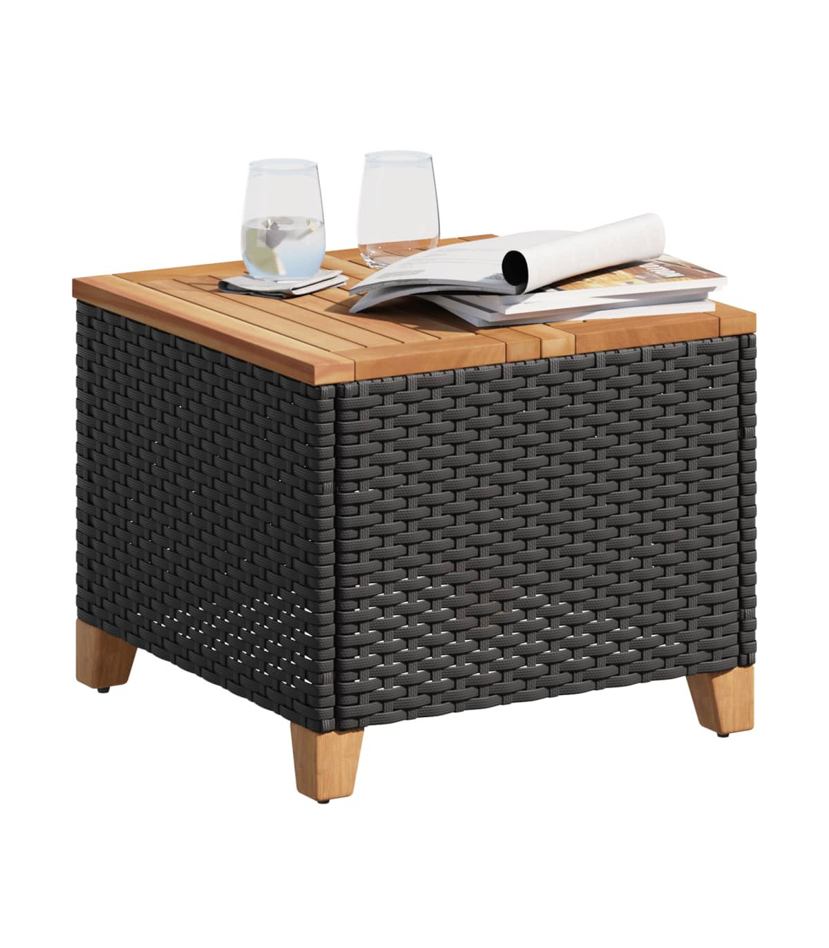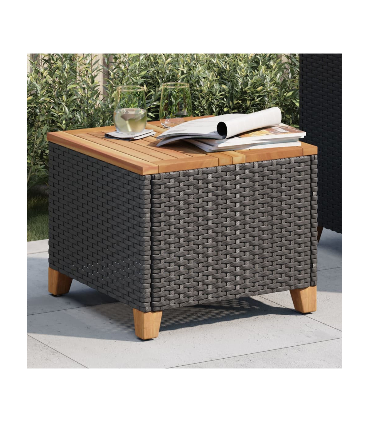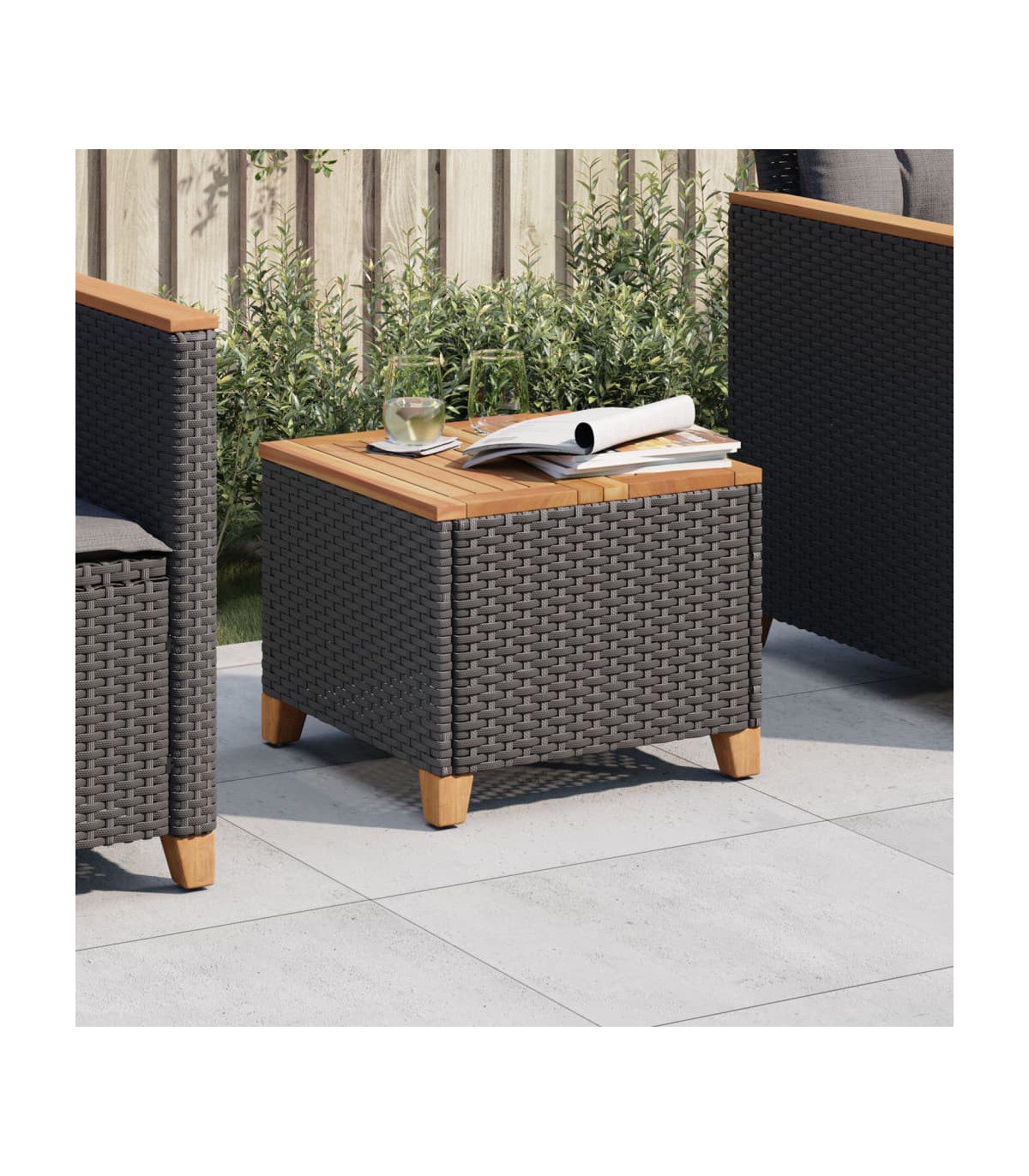 - Material: PE rattan, powder-coated steel, solid acacia wood with a natural finish