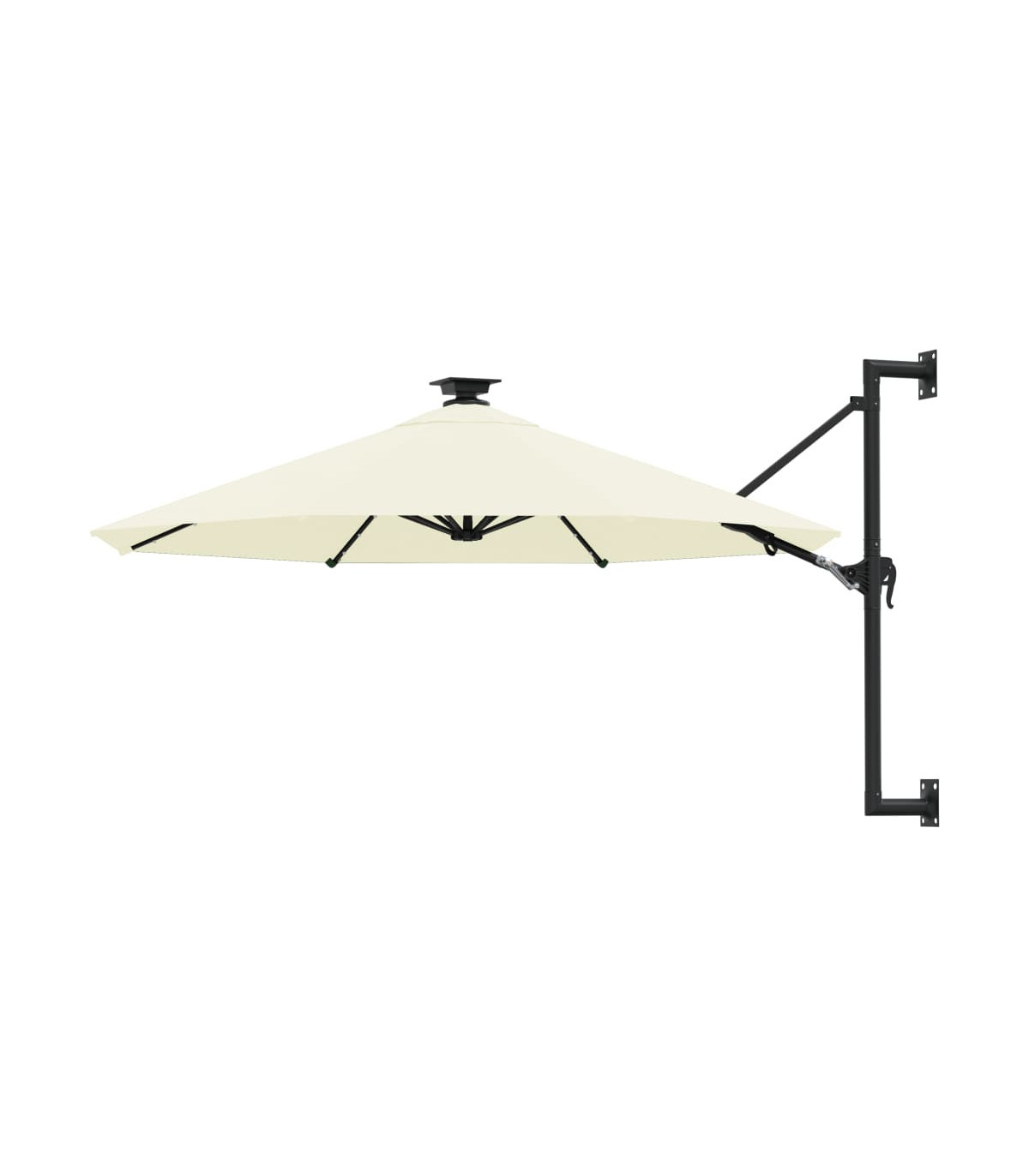 This elegant wall-mounted parasol safeguards your skin health by blocking most of the UV light. Made of UV protective and anti-fade polyester, the parasol cover provides you with optimum protection against the sun and is easy to clean. The exclusive design of this umbrella allows you to tilt it to block the sun as it heads down towards the horizon. The strong metal pole, along with the 8 durable ribs, makes the wall-mounted parasol very stable and durable. The garden umbrella can be easily opened and closed thanks to the crank mechanism. The integrated 28 LED lights create a cosy and romantic ambience at night. Please note that we recommend treating the umbrella fabric with a waterproofing spray if it is subjected to heavy rainfall. The height of this wall-mounted parasol depends on the height it is mounted on the wall.