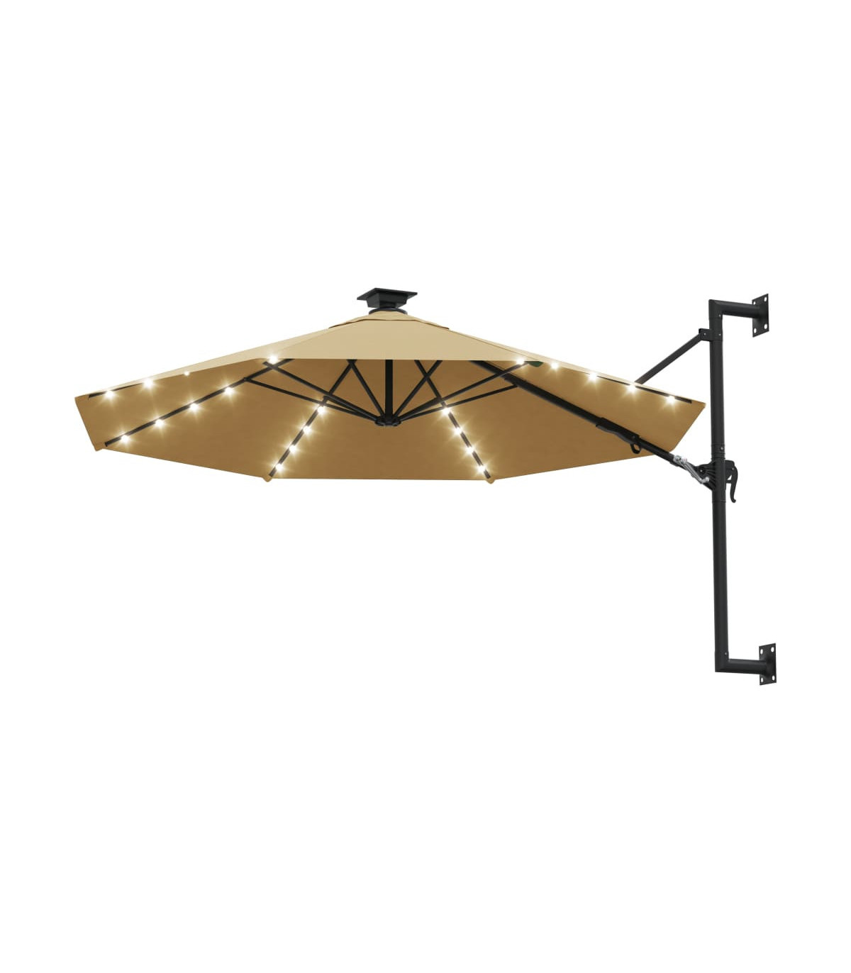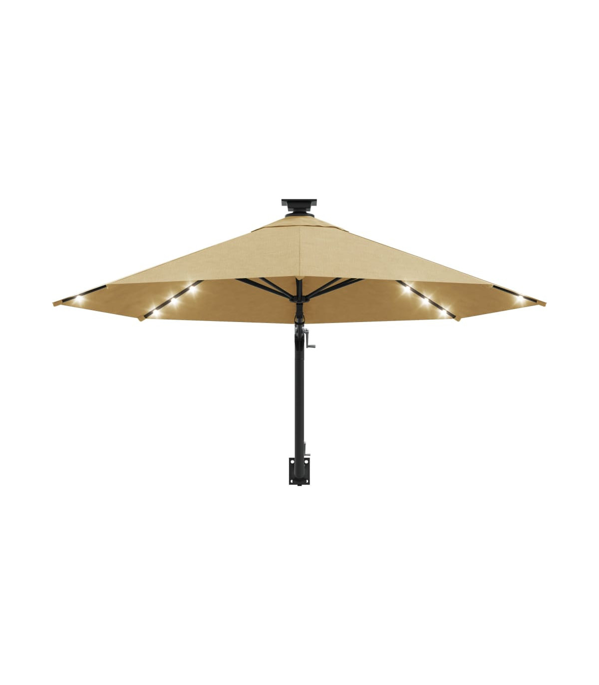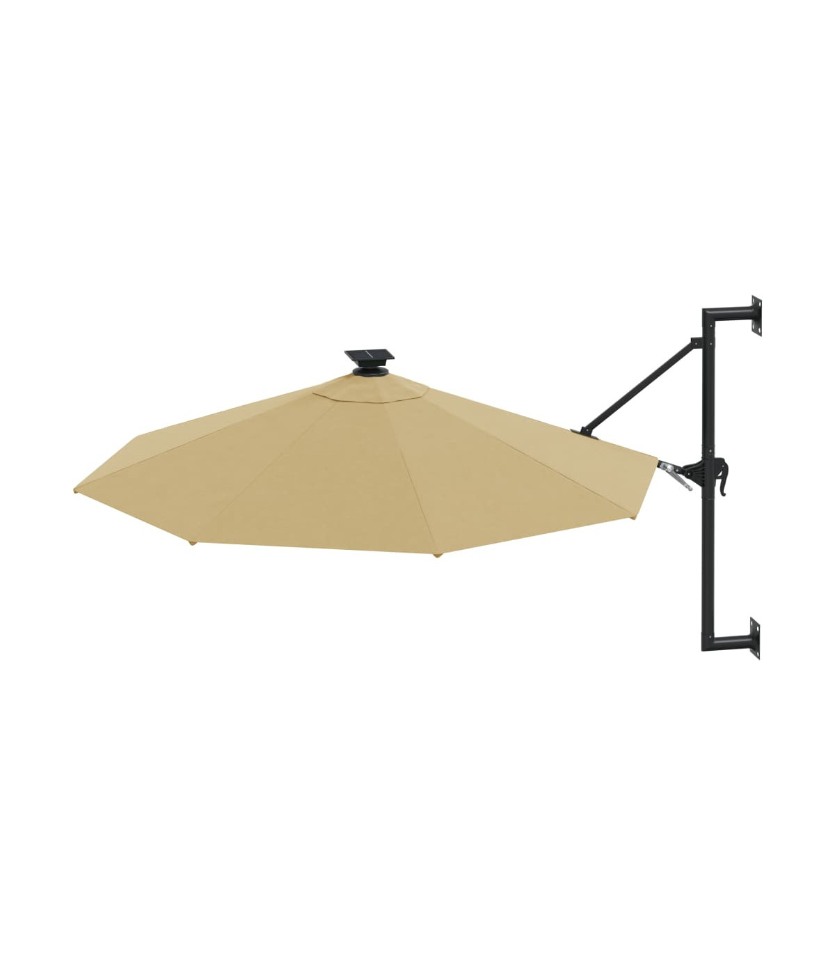 This elegant wall-mounted parasol safeguards your skin health by blocking most of the UV light. Made of UV protective and anti-fade polyester, the parasol cover provides you with optimum protection against the sun and is easy to clean. The exclusive design of this umbrella allows you to tilt it to block the sun as it heads down towards the horizon. The strong metal pole, along with the 8 durable ribs, makes the wall-mounted parasol very stable and durable. The garden umbrella can be easily opened and closed thanks to the crank mechanism. The integrated 28 LED lights create a cosy and romantic ambience at night. Please note that we recommend treating the umbrella fabric with a waterproofing spray if it is subjected to heavy rainfall. The height of this wall-mounted parasol depends on the height it is mounted on the wall.