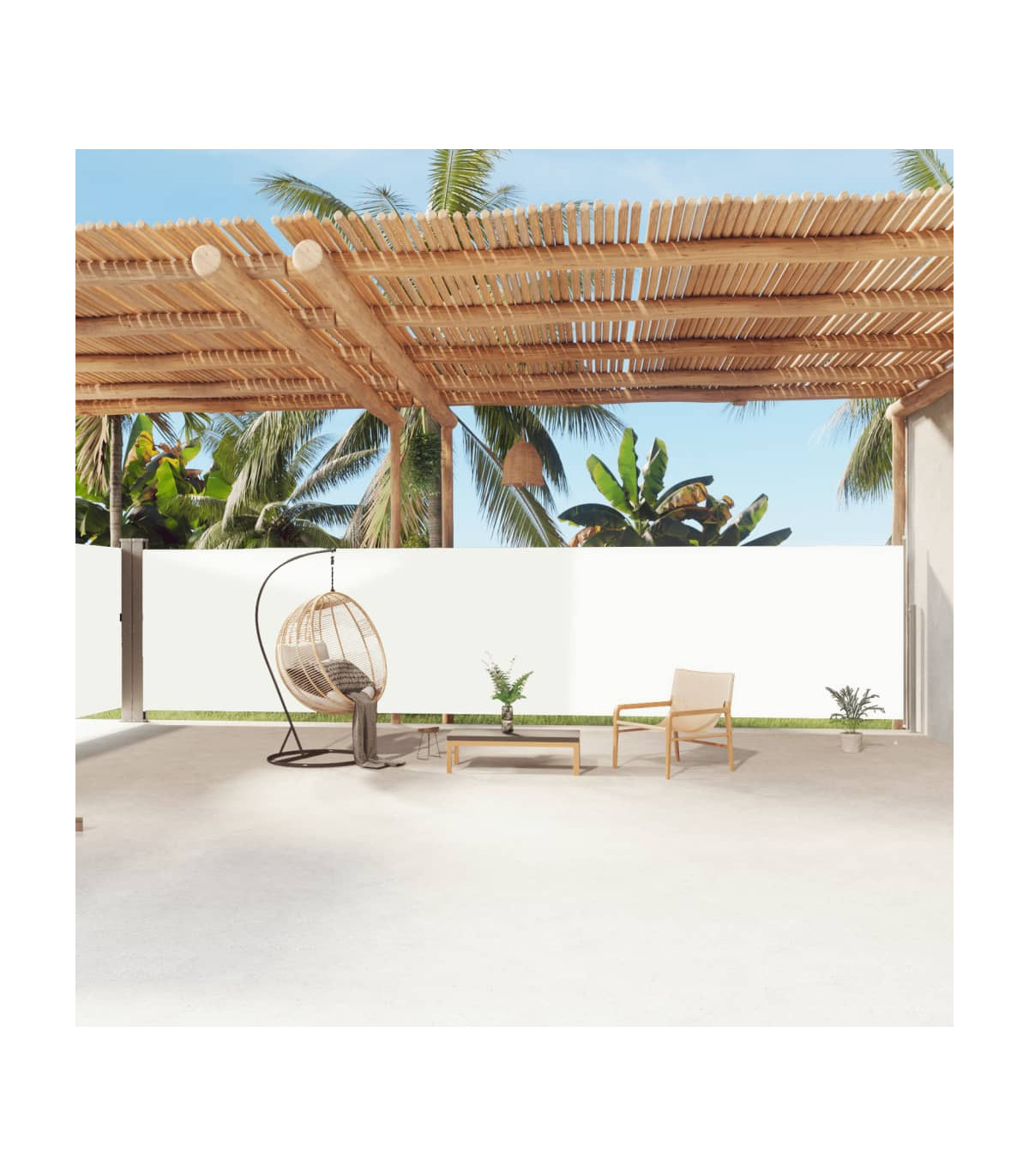 Our garden side awning, featuring a large screen, presents an effective way to deal with a constant wind and low-lying sun, while providing privacy. The simple yet stylish design makes it an ideal complement for your garden, patio, balcony, etc. The privacy screen has an automatic roll-back function and the width is adjustable to up to 600 cm. The outdoor screen is made of UV-proof, tear-resistant and water-resistant polyester fabric with a PU coating. Delivery also includes mounting accessories and 2 posts.