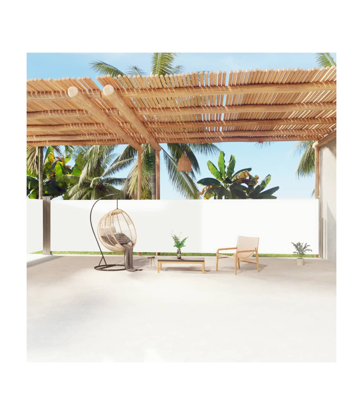 Our garden side awning, featuring a large screen, presents an effective way to deal with a constant wind and low-lying sun, while providing privacy. The simple yet stylish design makes it an ideal complement for your garden, patio, balcony, etc. The privacy screen has an automatic roll-back function and the width is adjustable to up to 600 cm. The outdoor screen is made of UV-proof, tear-resistant and water-resistant polyester fabric with a PU coating. Delivery also includes mounting accessories and 2 posts.