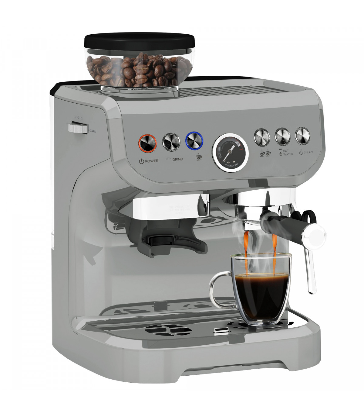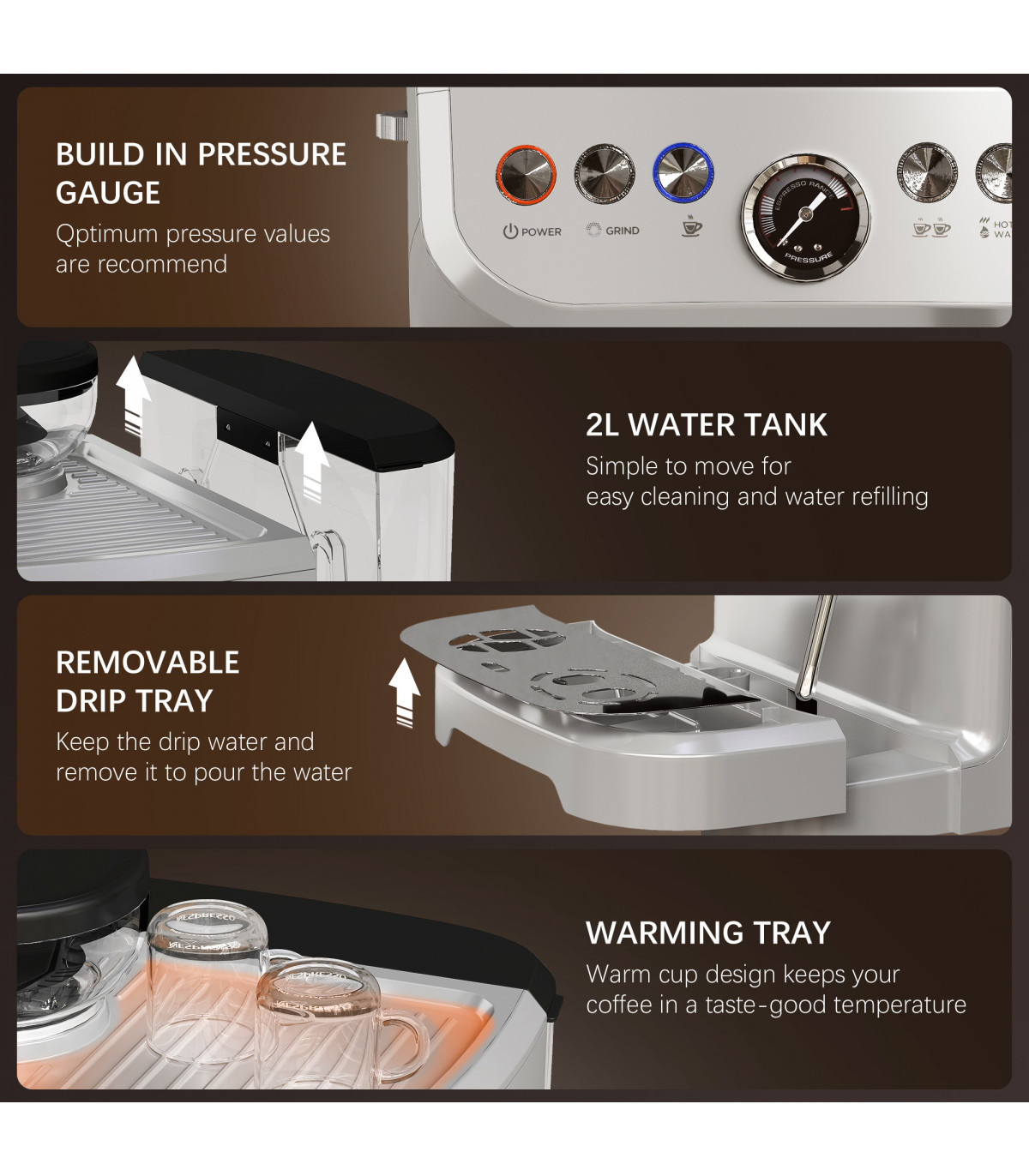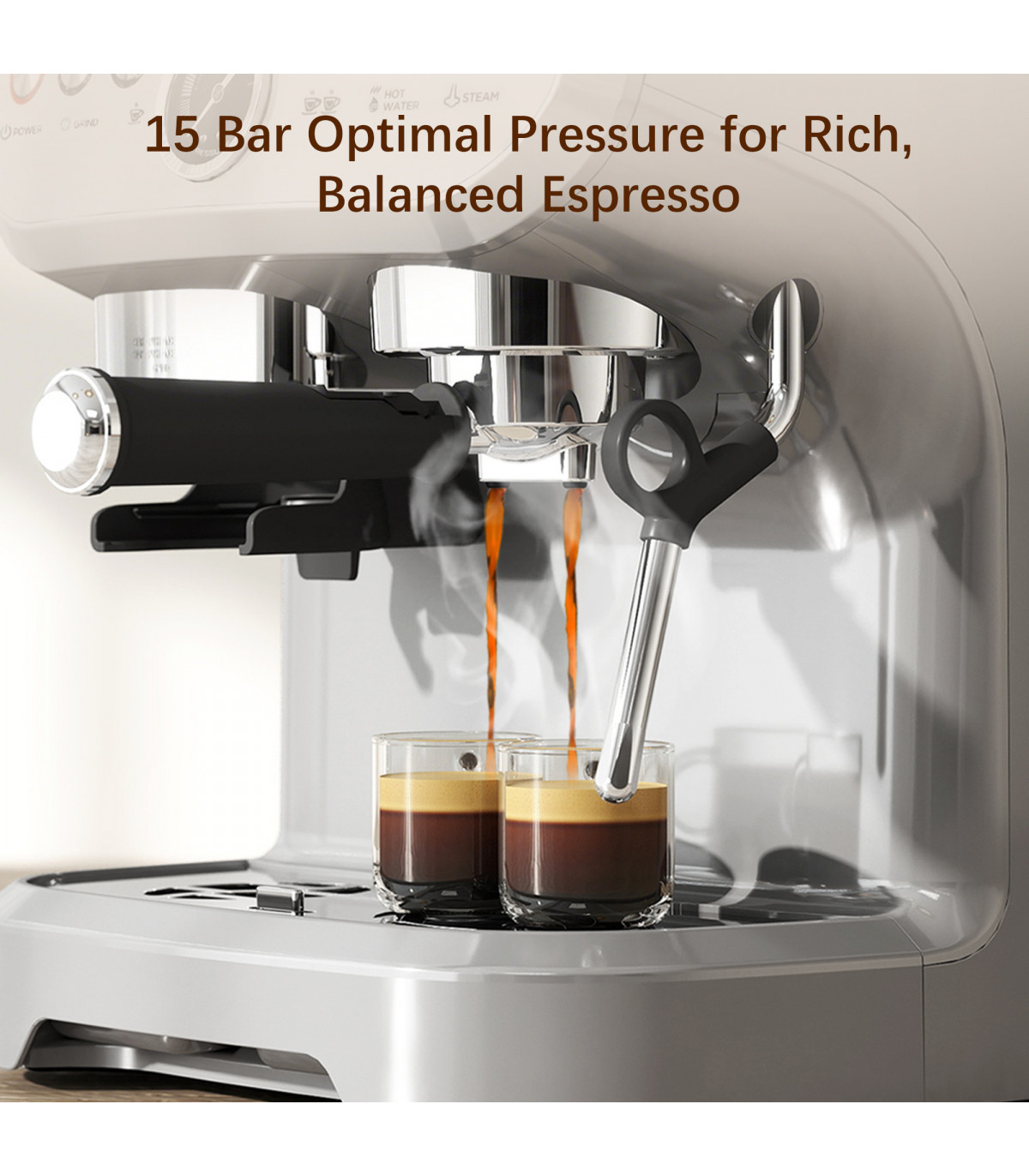 ? 15 bar pressure extracts coffee for a rich crema. Visible pressure gauge for safety