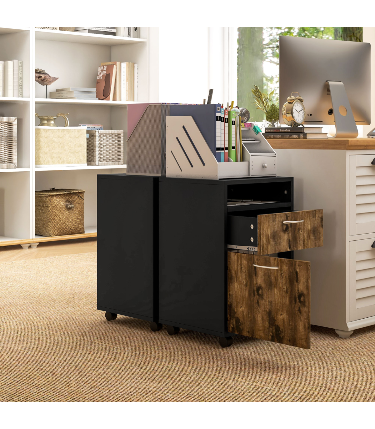 ? Top open shelf for easy access to what you need, flat tabletop for extra holding room