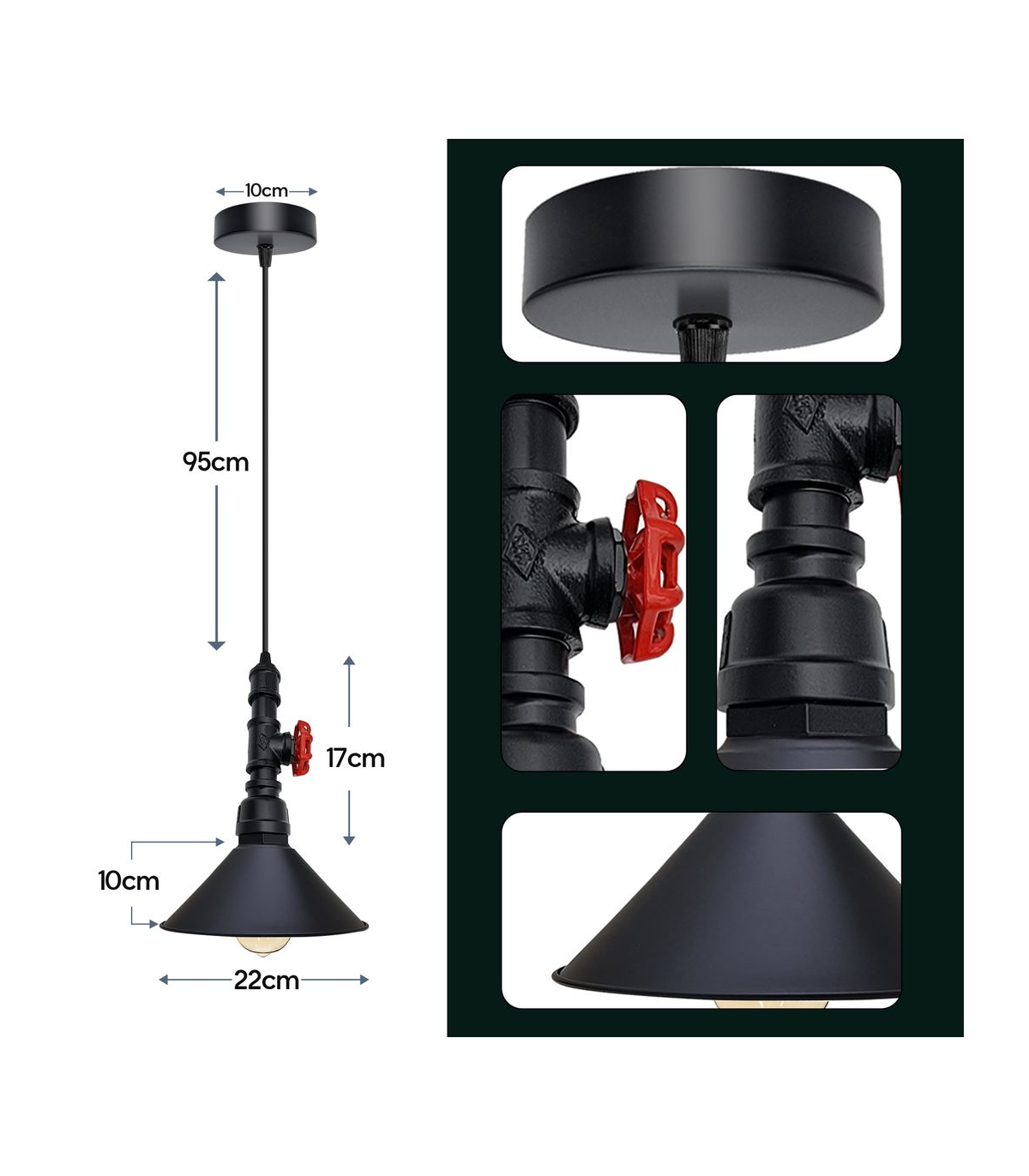 Features: This pendant lamp is made of metal and water pipe light which are high-quality materials. The strict factory processes will ensure the quality of the product in your hand. It includes black colour ceiling rose perfect for fabric flex cable, 100mm Metal ceiling light fitting plate with accessories for ceiling pendent light. Designed with E27 lamp base, E27 standard bulb Item Specifications / Technical Details: Product Name: Hanging pendant steampunk water pipe light Style: Vintage/Retro Voltage: AC110V-240V Lamp holder quantity: 1 Material: Metal and PVC Bulb Requirements: Requires E27 max 60W Bulb Type: Compatible with all kinds of E27 Bulbs Installation Area: Indoor Power Source: Hardwired Dimmable: Yes (required a dimmable bulb and dimmer switch) Wire length : 95cm Adjustable Cable Energy consumption: A+ with LED bulb Item included: 1x Pipe holder with wire. 1x Ceiling rose with accessories. 1xLamp shade