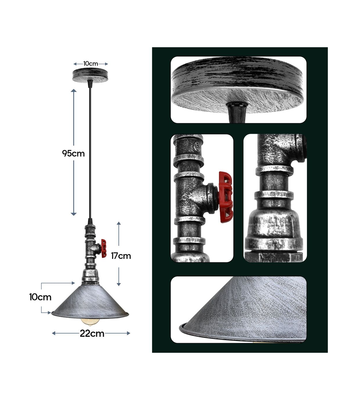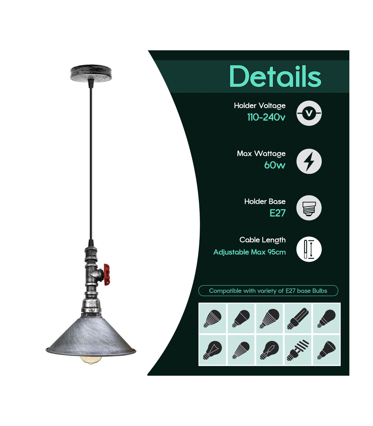 Features: This pendant lamp is made of metal and water pipe light which are high-quality materials. The strict factory processes will ensure the quality of the product in your hand. It includes black colour ceiling rose perfect for fabric flex cable, 100mm Metal ceiling light fitting plate with accessories for ceiling pendent light. Designed with E27 lamp base, E27 standard bulb Item Specifications / Technical Details: Product Name: Hanging pendant steampunk water pipe light Style: Vintage/Retro Voltage: AC110V-240V Lamp holder quantity: 1 Material: Metal and PVC Bulb Requirements: Requires E27 max 60W Bulb Type: Compatible with all kinds of E27 Bulbs Installation Area: Indoor Power Source: Hardwired Dimmable: Yes (required a dimmable bulb and dimmer switch) Wire length : 95cm Adjustable Cable Energy consumption: A+ with LED bulb Item included: 1x Pipe holder with wire. 1x Ceiling rose with accessories. 1xLamp shade