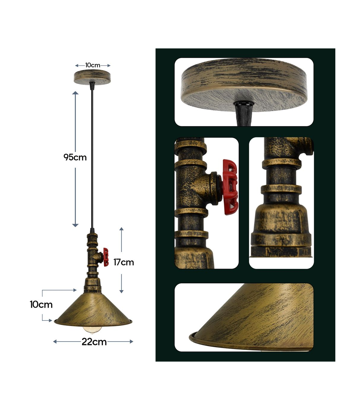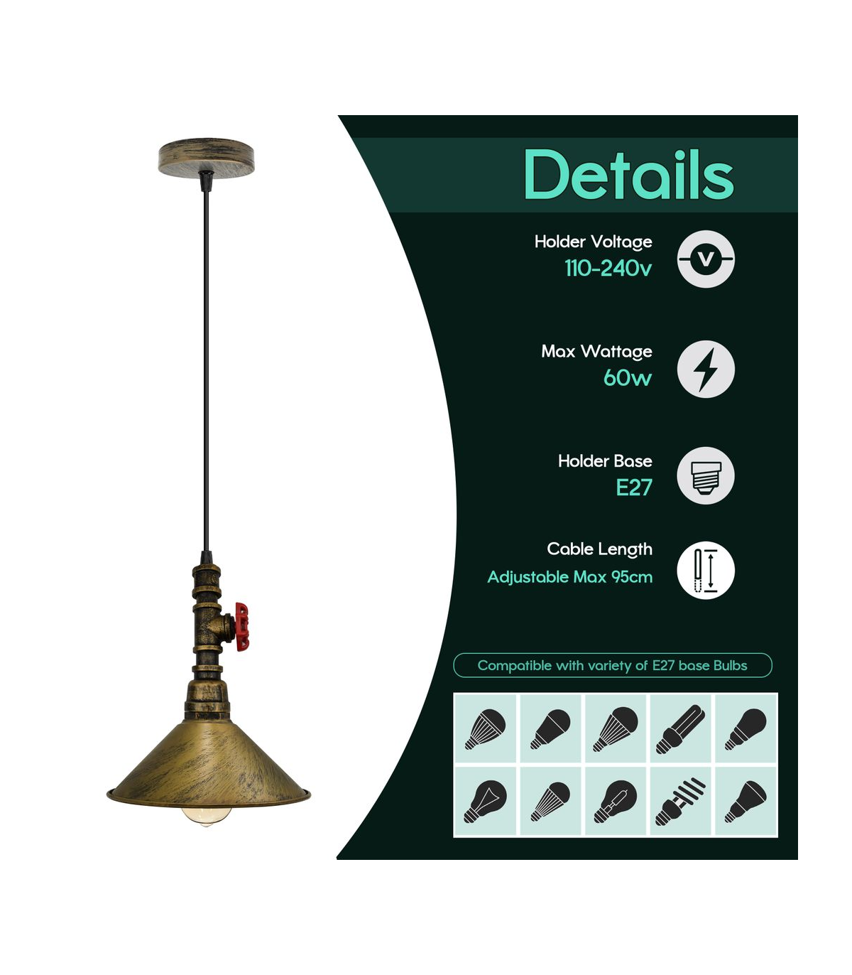 Features: This pendant lamp is made of metal and water pipe light which are high-quality materials. The strict factory processes will ensure the quality of the product in your hand. It includes black colour ceiling rose perfect for fabric flex cable, 100mm Metal ceiling light fitting plate with accessories for ceiling pendent light. Designed with E27 lamp base, E27 standard bulb Item Specifications / Technical Details: Product Name: Hanging pendant steampunk water pipe light Style: Vintage/Retro Voltage: AC110V-240V Lamp holder quantity: 1 Material: Metal and PVC Bulb Requirements: Requires E27 max 60W Bulb Type: Compatible with all kinds of E27 Bulbs Installation Area: Indoor Power Source: Hardwired Dimmable: Yes (required a dimmable bulb and dimmer switch) Wire length : 95cm Adjustable Cable Energy consumption: A+ with LED bulb Item included: 1x Pipe holder with wire. 1x Ceiling rose with accessories. 1xLamp shade