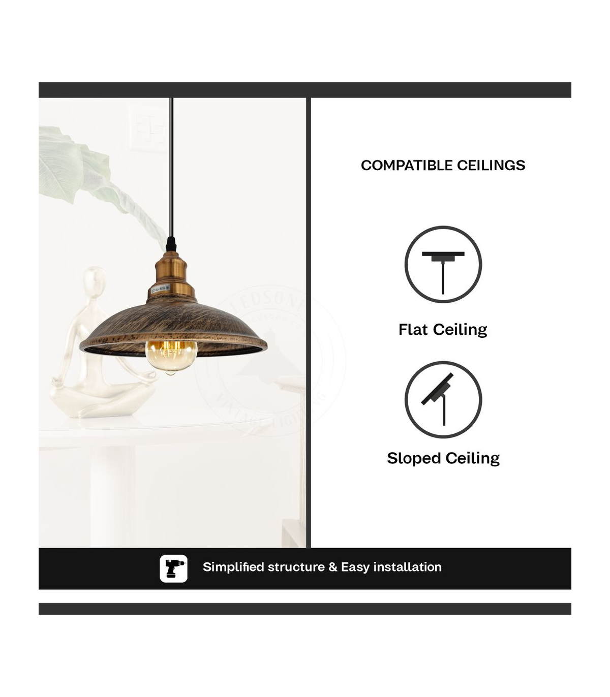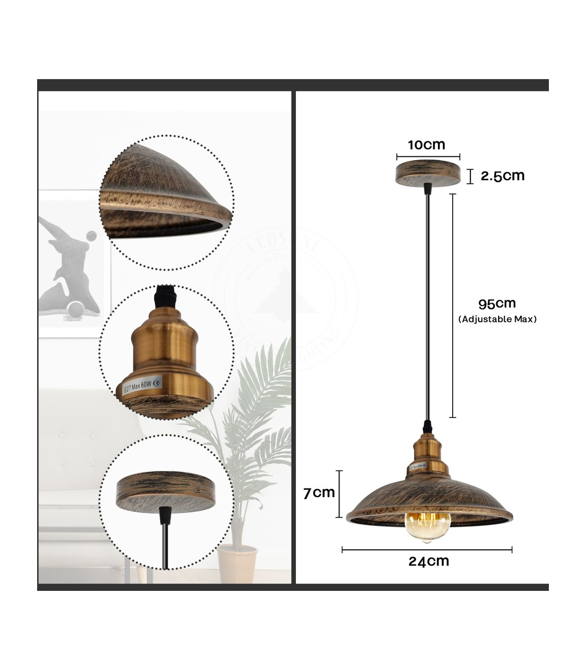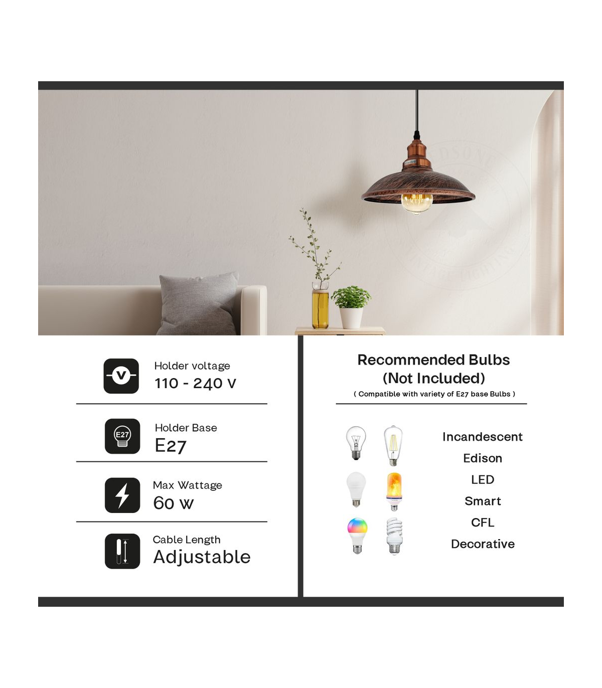 Features: This simple, sleek pendant has a finished appearance for a vintage appearance. A white painted on the inside of the hood enhances the illumination. It will make your home more interesting and attractive. E27 lamp base, you can choose any bulbs with the E27 interface as you want. Perfect to create a warm, romantic atmosphere for your home. Item Specifications: Item Type: Pendant lamp kit Style: Vintage/Retro Voltage:110V-240V Lamp holder quantity:1 Material: Metal and PVC Bulb Requirements: Requires E27 max 60W Bulb Type: Compatible with all kinds of E27 bulbs Installation Area: Indoor Power Source: Hardwired Dimmable: Yes (Required a dimmable bulb and dimmer switch) Wire length: 95cm Adjustable cable. Energy consumption: A+ with LED bulb. Sloped ceiling adaptable. Package included: 1 x Ceiling rose with accessories. 1 x Pendant holder with cable and chain. 1 x Light shade.