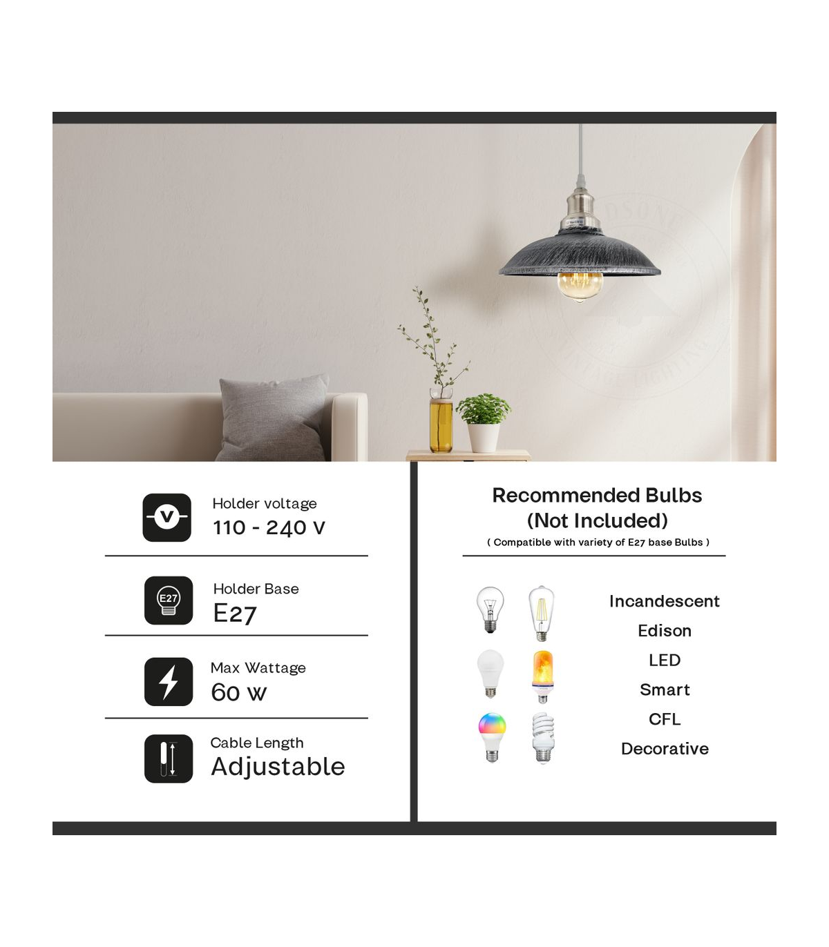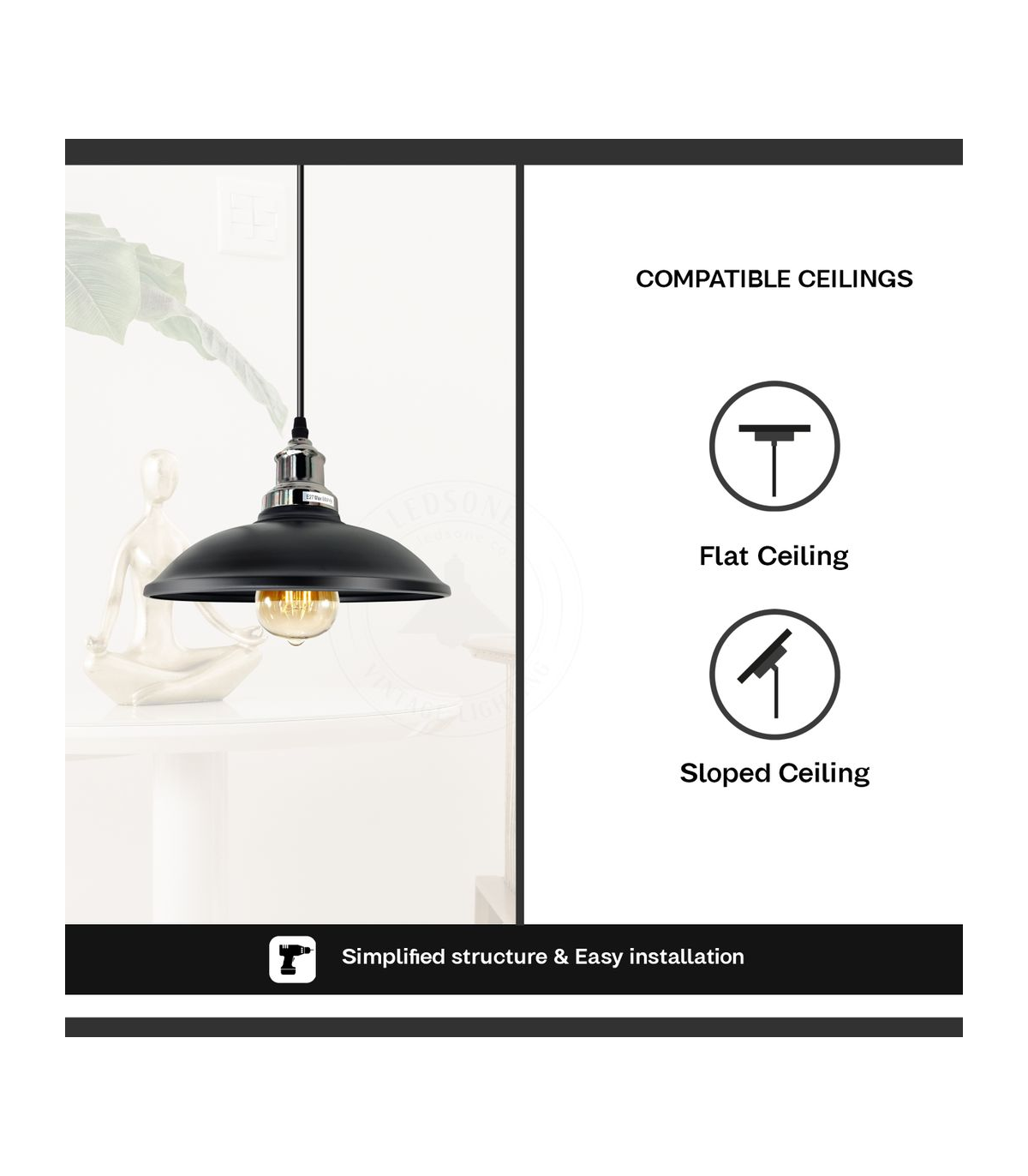 Features: This simple, sleek pendant has a finished appearance for a vintage appearance. A white painted on the inside of the hood enhances the illumination. It will make your home more interesting and attractive. E27 lamp base, you can choose any bulbs with the E27 interface as you want. Perfect to create a warm, romantic atmosphere for your home. Item Specifications: Item Type: Pendant lamp kit Style: Vintage/Retro Voltage:110V-240V Lamp holder quantity:1 Material: Metal and PVC Bulb Requirements: Requires E27 max 60W Bulb Type: Compatible with all kinds of E27 bulbs Installation Area: Indoor Power Source: Hardwired Dimmable: Yes (Required a dimmable bulb and dimmer switch) Wire length: 95cm Adjustable cable. Energy consumption: A+ with LED bulb. Sloped ceiling adaptable. Package included: 1 x Ceiling rose with accessories. 1 x Pendant holder with cable and chain. 1 x Light shade.