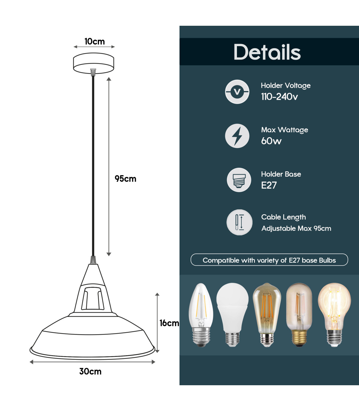 Features: This simple, sleek pendant has a finished appearance for a vintage appearance. A wonderful choice for achieving your desired fashion and functional needs of your home. It will make your home more interesting and attractive. E27 lamp base, you can choose any bulbs with the E27 interface as you want. Perfect to create a warm, romantic atmosphere for your home. Item Specifications: Item Type: Pendant lamp kit Style: Vintage/Retro Voltage: 110V-240V Lamp holder quantity: 1 Material: Metal and PVC Bulb Requirements: Requires E27 max 60W Bulb Type: Compatible with all kinds of E27 bulbs Installation Area: Indoor Power Source: Hardwired Dimmable: Yes (Required a dimmable bulb and dimmer switch) Wire length: 95cm Adjustable cable. Energy consumption: A+ with LED bulb. Sloped ceiling adaptable. Package included: 1 x Celling rose with accessories. 1 x Pendant holder with 95cm cable. 1 x Light shade.