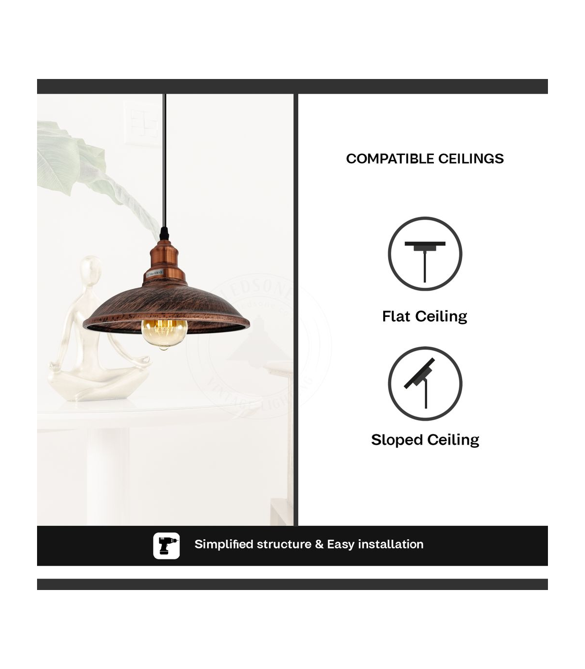 Features: This simple, sleek pendant has a finished appearance for a vintage appearance. A white painted on the inside of the hood enhances the illumination. It will make your home more interesting and attractive. E27 lamp base, you can choose any bulbs with the E27 interface as you want. Perfect to create a warm, romantic atmosphere for your home. Item Specifications: Item Type: Pendant lamp kit Style: Vintage/Retro Voltage:110V-240V Lamp holder quantity:1 Material: Metal and PVC Bulb Requirements: Requires E27 max 60W Bulb Type: Compatible with all kinds of E27 bulbs Installation Area: Indoor Power Source: Hardwired Dimmable: Yes (Required a dimmable bulb and dimmer switch) Wire length: 95cm Adjustable cable. Energy consumption: A+ with LED bulb. Sloped ceiling adaptable. Package included: 1 x Ceiling rose with accessories. 1 x Pendant holder with cable and chain. 1 x Light shade.
