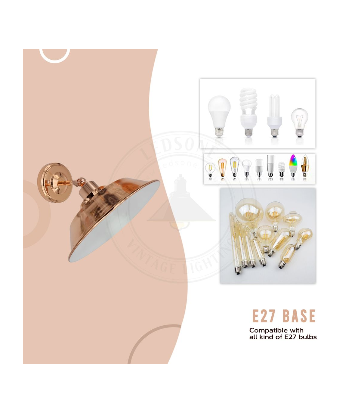 Features: This bowl shaped sturdy metal shade decorate the spaces with the vintage style with the retro elegant touch, let the home be everywhere, warm and comfortable. Not only lighting but also decorating your house, It will make your space more interesting and attractive. Comes with standard E27 Edison bulb light socket. Has 3 year manufacturer warranty. Ideal for living rooms, lounges, bedrooms, home offices, studies, studios, apartments, hotels, restaurants, cafes and more! Item Specifications / Technical Details: Item Type: Wall light Style: Vintage/Retro Voltage: AC110V-240V Lamp holder quantity: 1 Material: Sturdy metal Bulb Requirements: Requires E27 max 60W Bulb Type: Compatible with all kinds of E27 Bulbs Installation Area: Indoor Power Source: Hardwired Dimmable: Yes (required a dimmable bulb and dimmer switch) Energy consumption: A+ with LED bulb Sloped ceiling adaptable Package included: 1 x Ceiling rose and accessories. 1 x Lamp shade. 1 x Lamp holder. ​