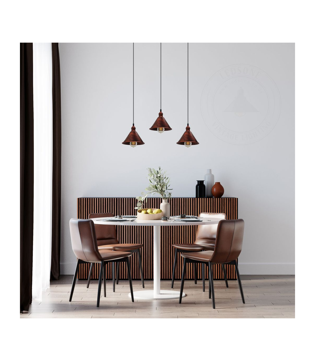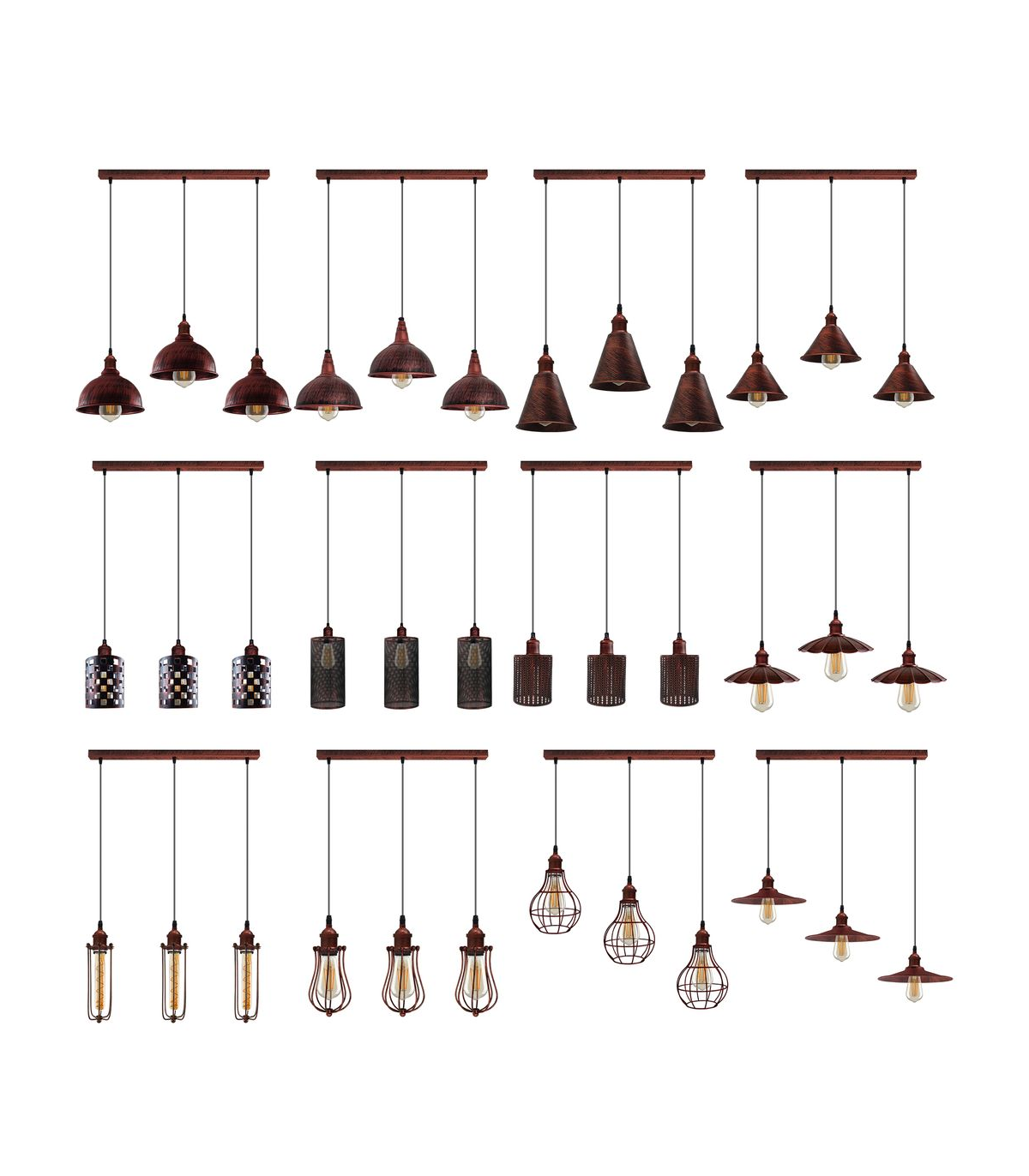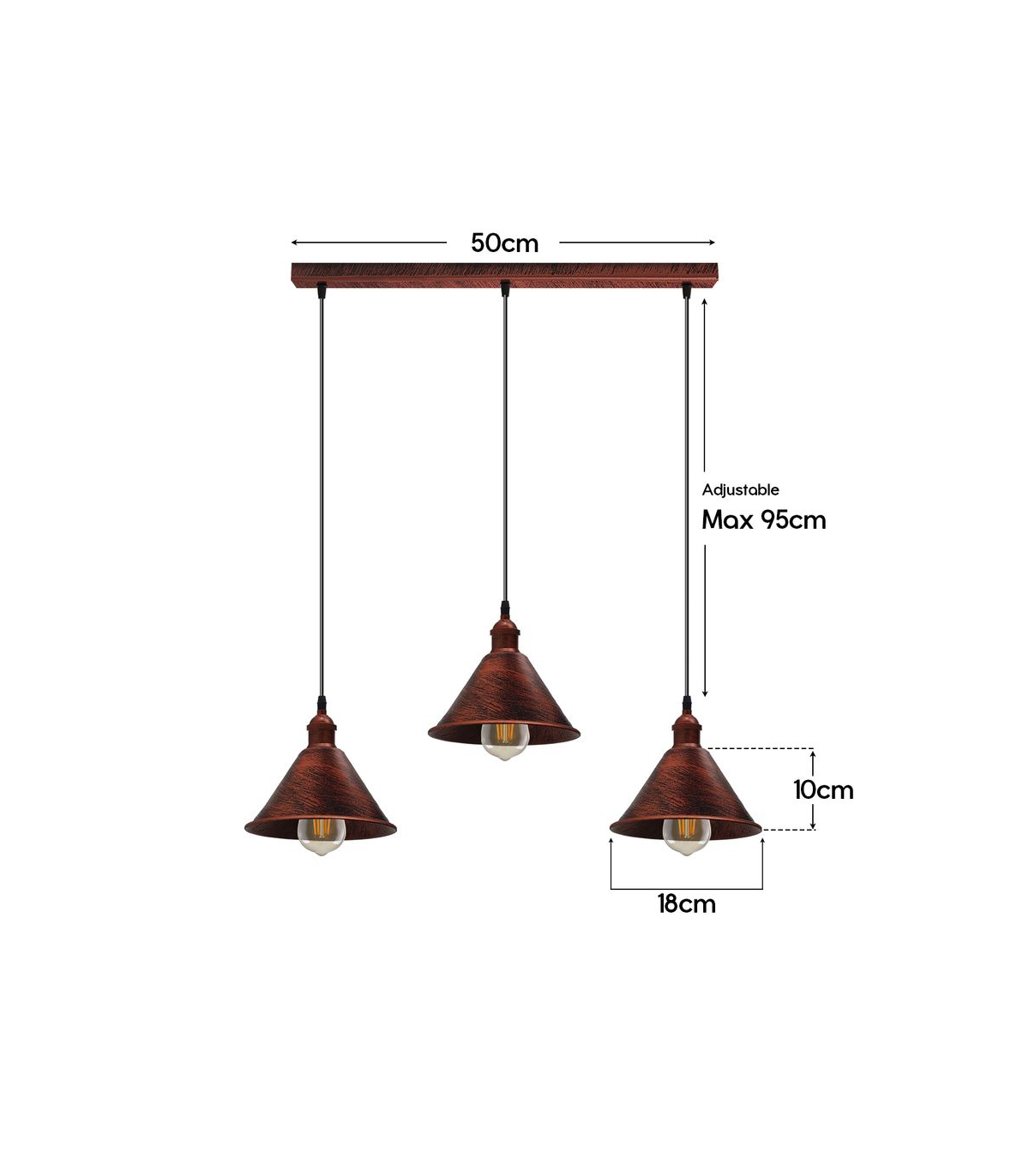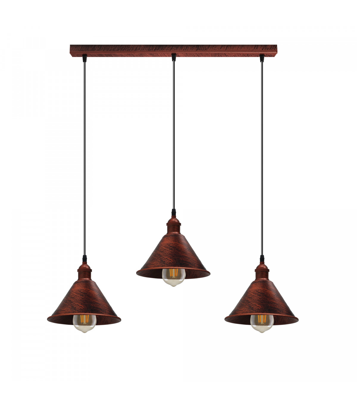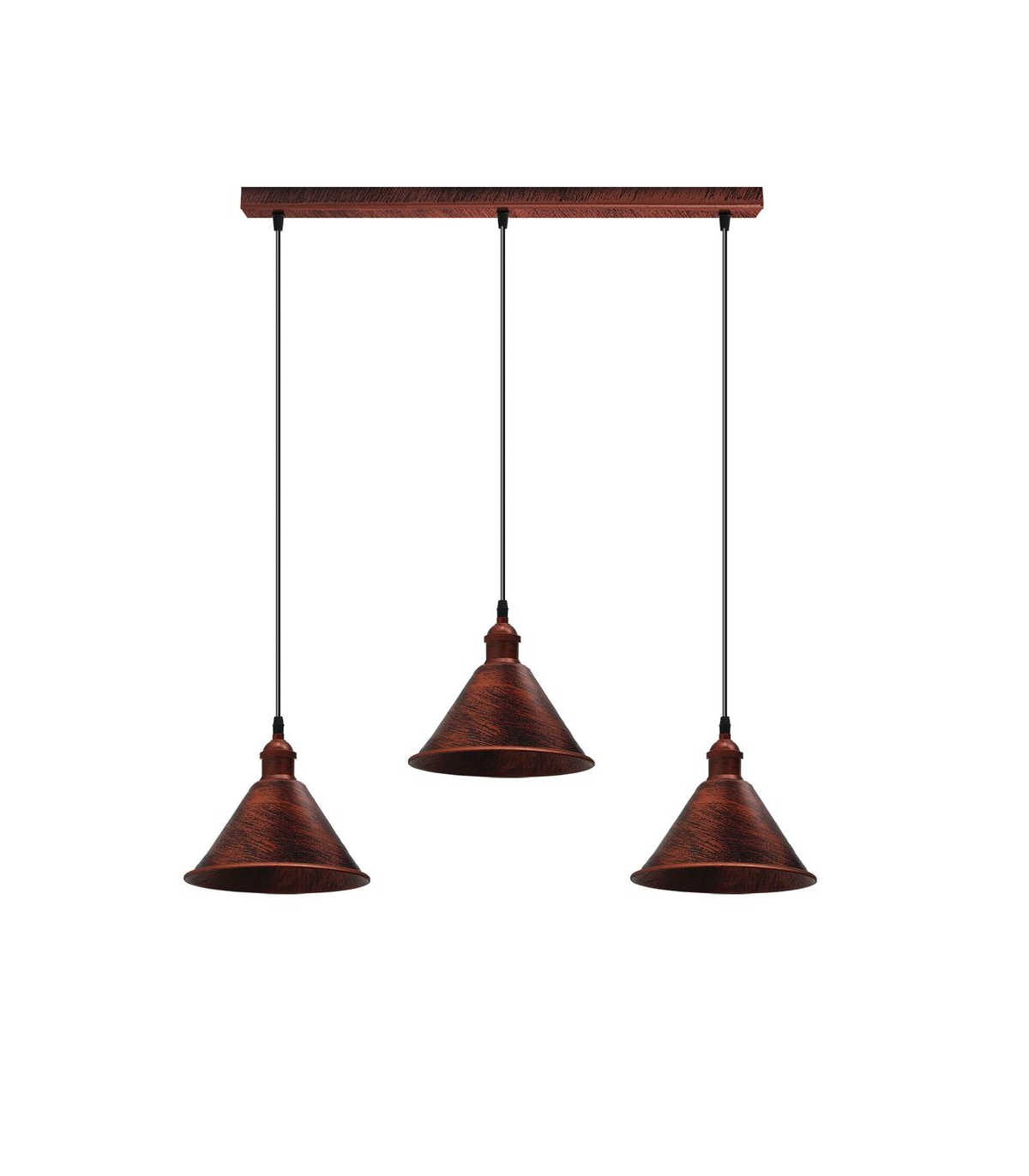 Vintage Industrial Rustic Red 3 Head Reactangle Pendant Cord E27 Base Metal Brushed Light Fitting Cone Shape Lamp Shade