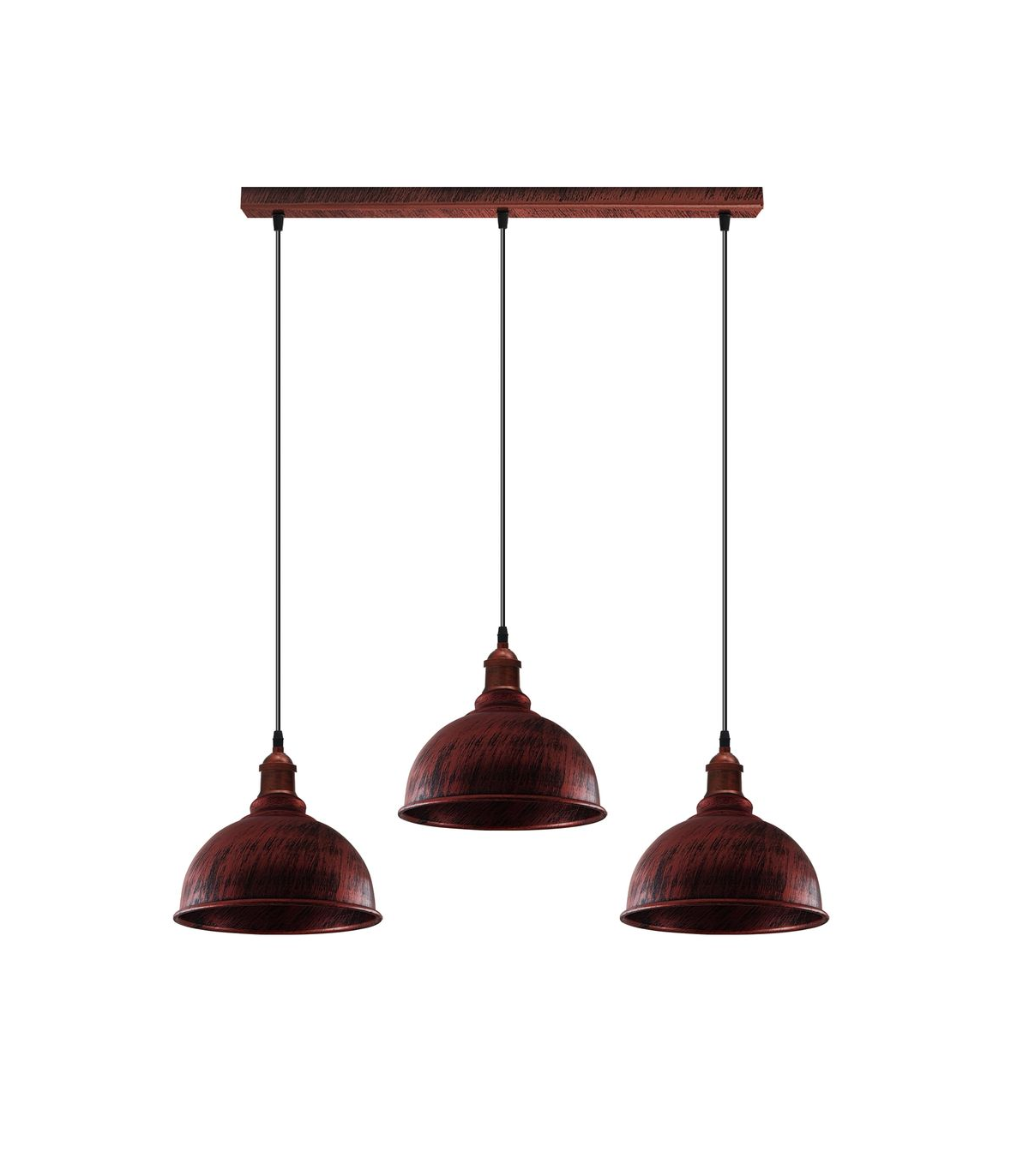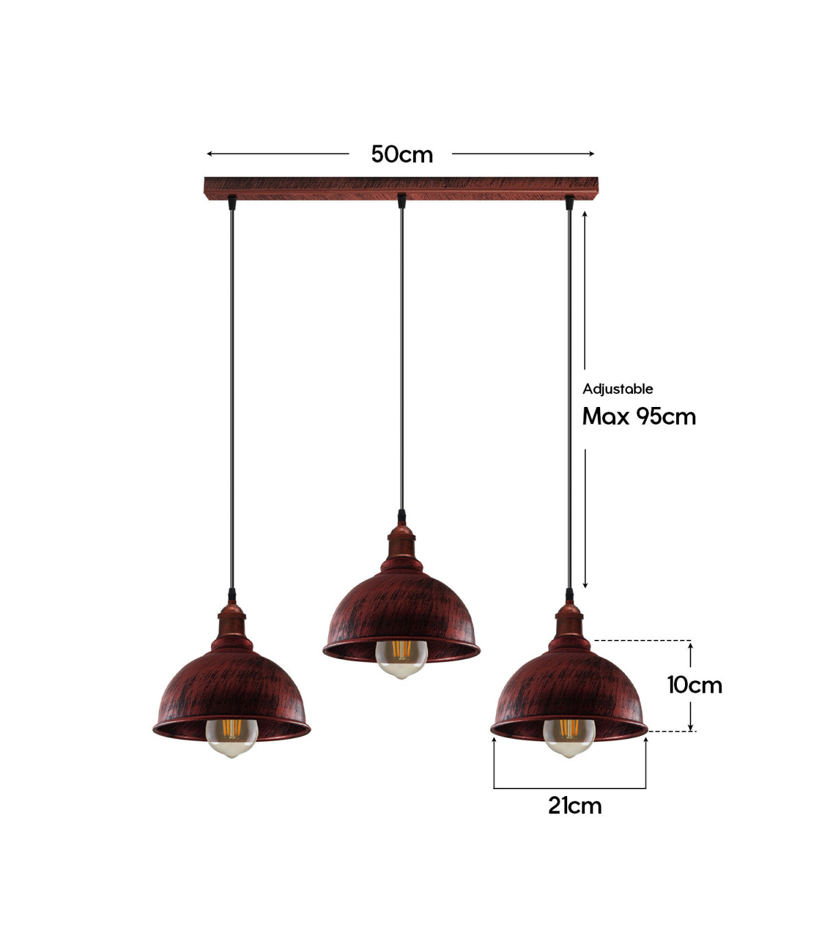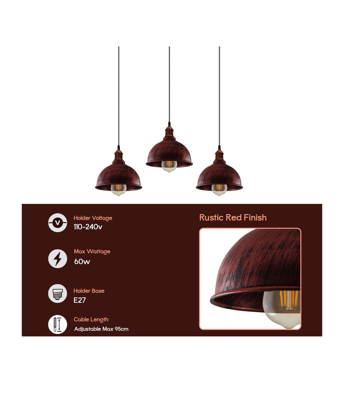 Vintage Industrial Rustic Red 3 Head Base Pendant Cord Light E27 Base Metal Brushed Light Fitting Small Curvy Lamp Shade