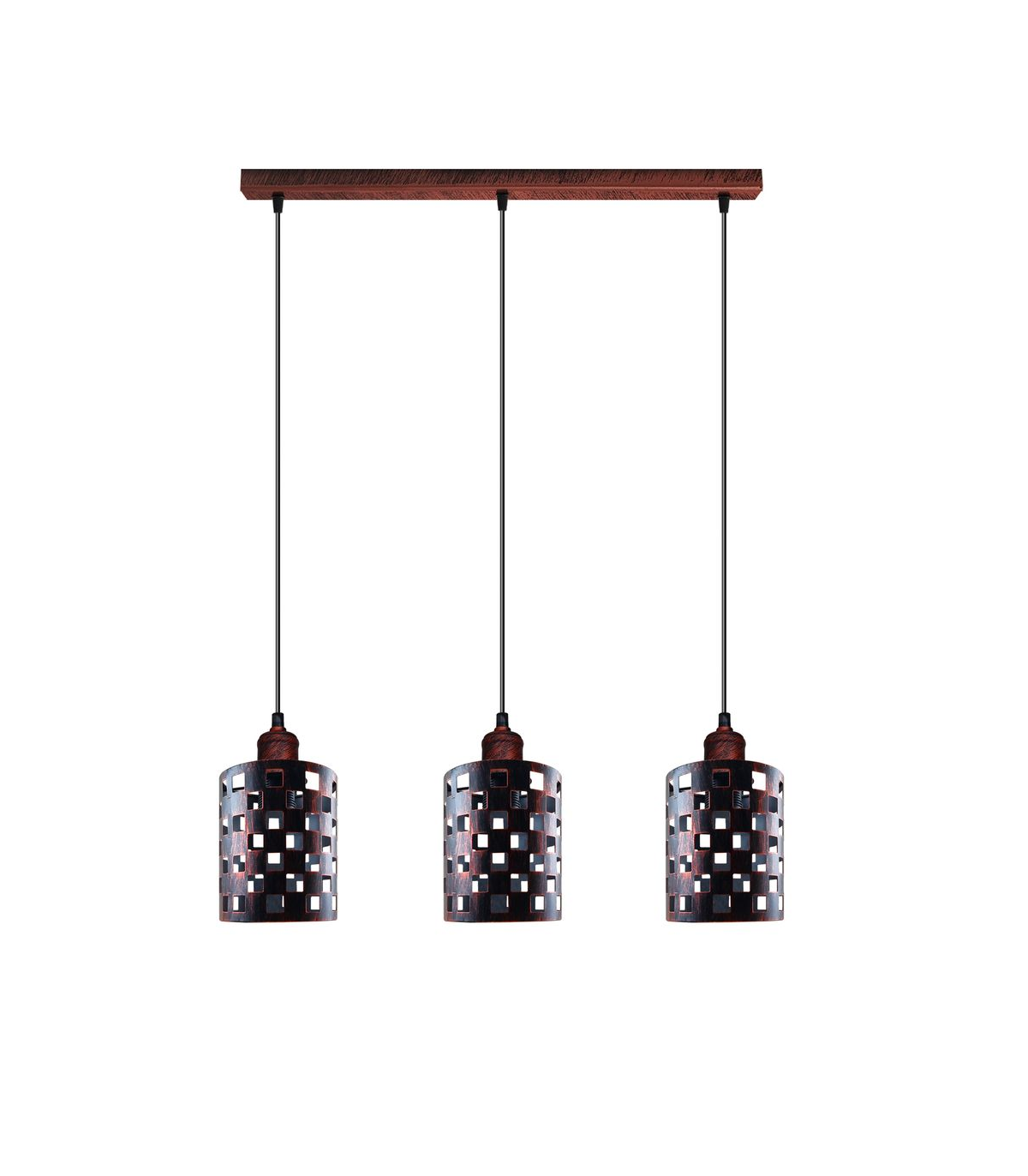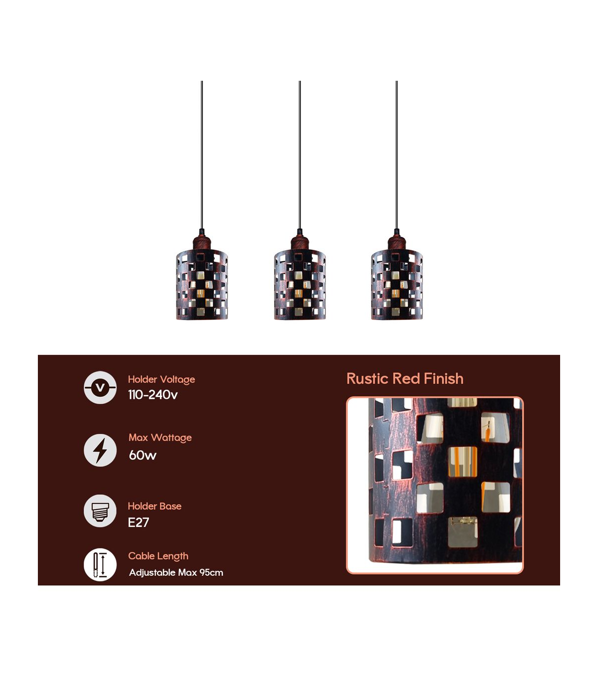 Features: Designed to add a touch of rustic elegance to your home decoration, this metal, rustic red Reactangle Base ceiling pendant light will coordinate nicely with other items and augment the stylishness of your interior. This hanging is made of high-quality brushed metal, ensuring durability and longevity. The metal shade design also protects the bulb from damage. Provides soft and warm lighting that creates a cosy and welcoming atmosphere in any room. The pendant lighting fixtures can be used in a variety of spaces, including the living room,study room or any other living area. The lamp features an E27 base, which is a standard size for light bulbs, allowing for easy replacement and flexibility in terms of bulb type and wattage. Item Specifications and Technical Details: Type: ceiling pendant light Style: Vintage/Retro Base type: E27 Wire: 95cm Adjustable cable Power source: AC110V-240V Material: Metal Diameter of the Reactangle Base ceiling rose: 50cm Certificate: CE, RoHS Application: indoor