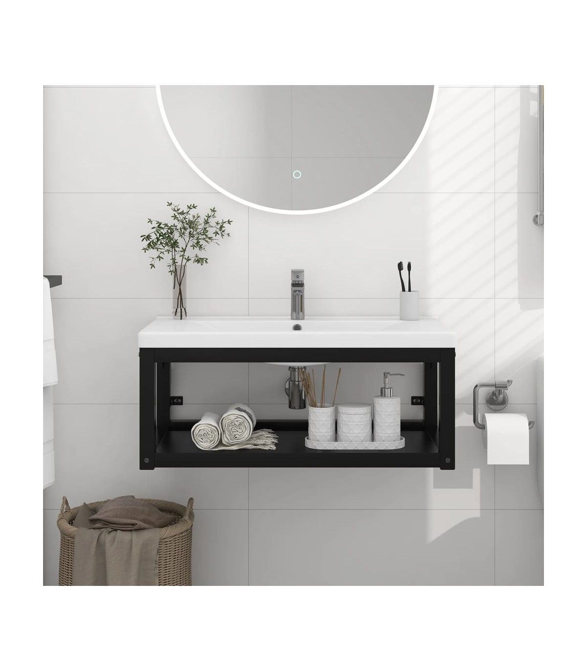 With this wall-mounted bathroom washbasin frame, you can create additional storage space for your bathroom with a clean, tidy appearance. Made of powder-coated iron, this wash stand is weather-resistant and durable. The washbasin frame gives easy access to towels and baskets and creates a more ample space than closed storage. The bathroom furniture is easy to clean with a damp cloth.