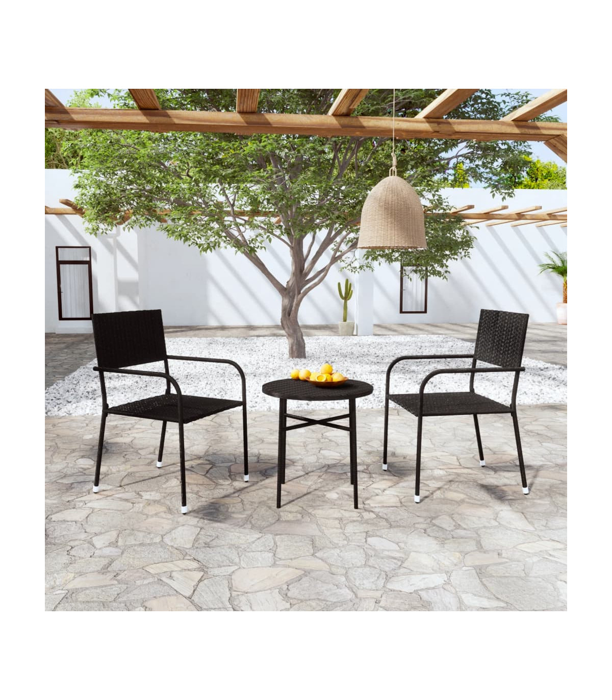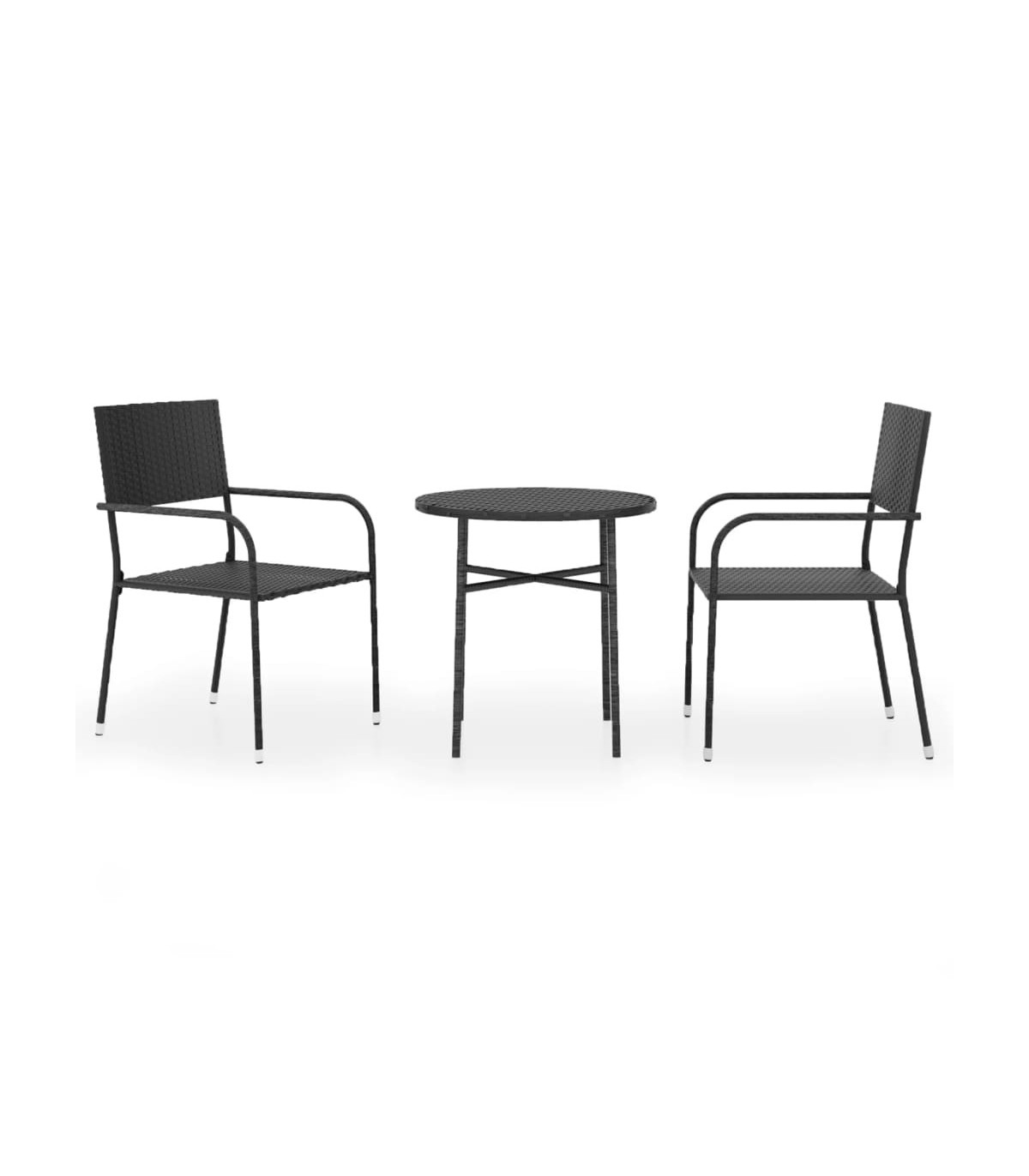 Enjoy a nice meal or afternoon tea in your outdoor space with this poly rattan garden dining set! Featuring an elegant design, it will become the focal point of your garden and patio! The practical outdoor dining set has a powder-coated steel frame covered with PE rattan, making it hardwearing, easy to clean, and suitable for daily outdoor use. The table is excellent for keeping drinks and food within reach. The chairs are lightweight and can be stacked to save space when not in use. Note: In order to extend the life of your outdoor furniture, we recommend you to clean it regularly and do not leave it outdoors without protection unnecessarily.Clean: Use a mild soap solution.Storing: If possible, store in a cool, dry place indoors. If the product is stored outdoors, protect it with a waterproof cover. Wipe and dry the excess water or snow from flat surfaces after a rain or snowfall. Allow sufficient air circulation to avoid moisture-related damage.