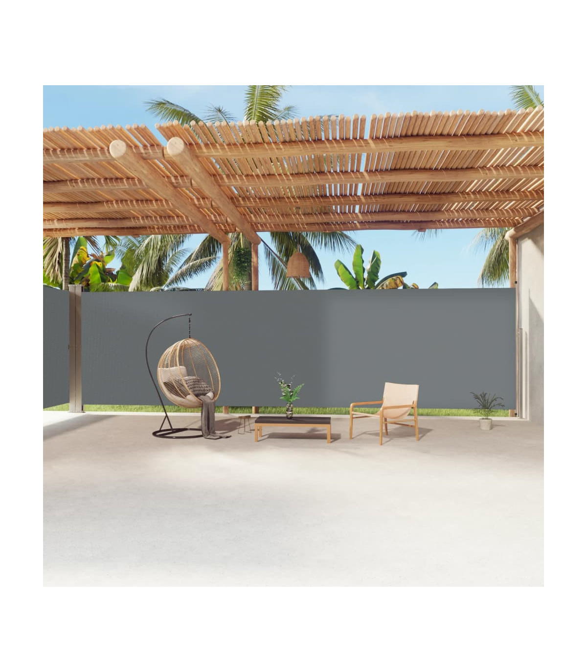 Our garden side awning, featuring a large screen, presents an effective way to deal with a constant wind and low-lying sun, while providing privacy. The simple yet stylish design makes it an ideal complement for your garden, patio, balcony, etc. The privacy screen has an automatic roll-back function and the width is adjustable to up to 600 cm. The outdoor screen is made of UV-proof, tear-resistant and water-resistant polyester fabric with a PU coating. Delivery also includes mounting accessories and 2 posts.