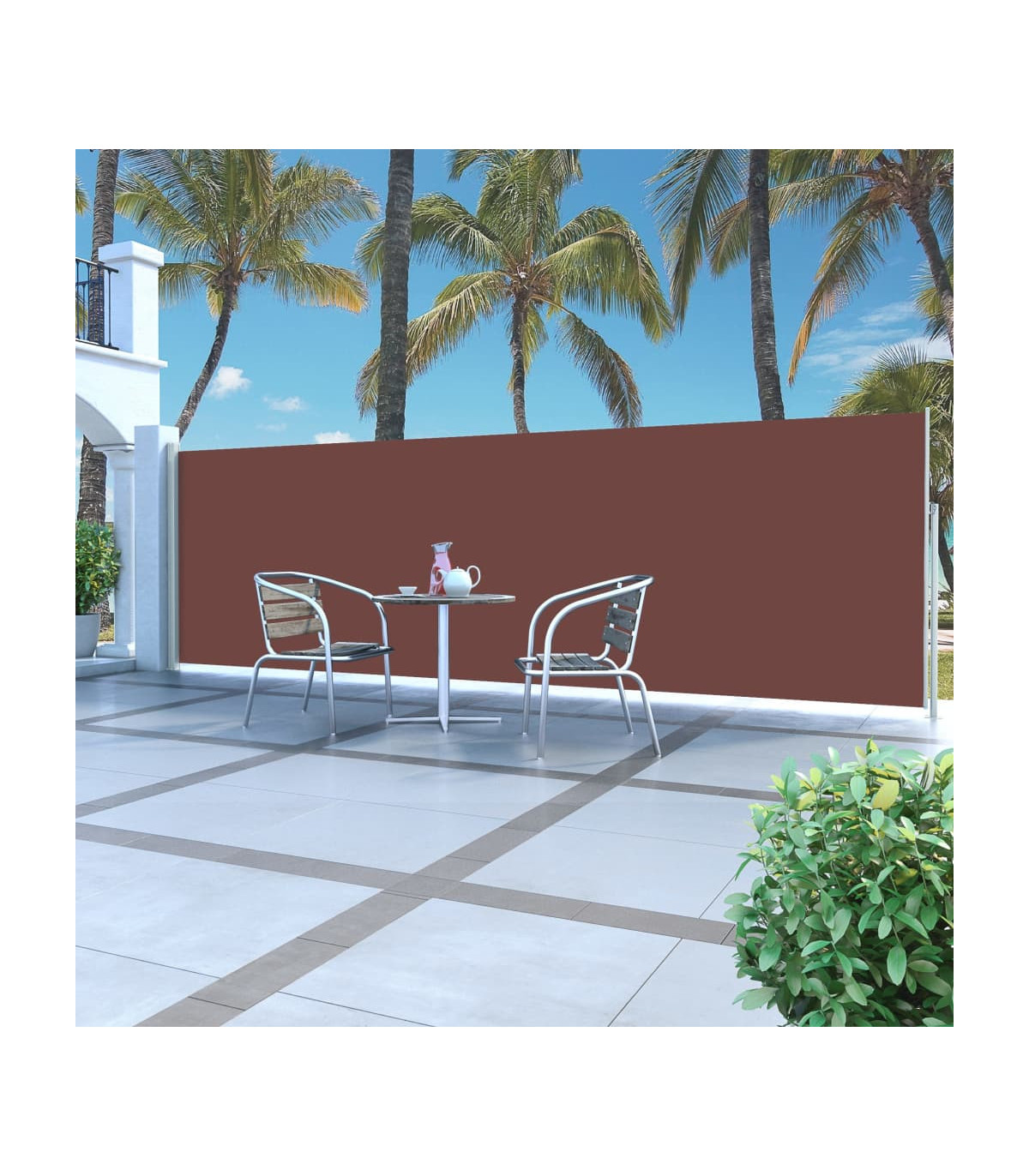 This simple yet stylish side awning creates a cosy little nook while providing the privacy you need in your terrace, patio or balcony. It can also help protect people from the wind and low-lying sun. The screen is made of UV and tear-resistant polyester. The cassette is installed on a sturdy steel base in the vertical position, and the retractable awning can be easily pulled straight out. The awning also has automatic roll-back function. The balcony awning is easy to assemble. Delivery includes mounting accessories.