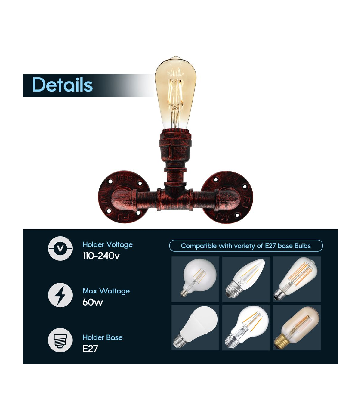 Features 100% Brand new and high quality. This wall lamp is made of fine metal and water pipe which are high-quality materials. The strict factory processes will ensure the quality of the product in your hand. It includes vintage industrial water pipe lamp retro light steampunk wall sconce light holder. Designed with E27 lamp base, E27 standard bulb. Item Specifications / Technical Details: Product Name: Water pipe lamp retro light steampunk wall sconce light holder Style: Vintage/Retro Voltage: AC110V-240V Lamp holder quantity: 1 Material: metal, PVC Bulb Requirements: Requires E27 max 60W Bulb Type: Compatible with all kinds of E27 bulbs Installation Area: Indoor Power Source: Hardwired Dimmable: Yes (required a dimmable bulb and dimmer switch) Energy consumption: A+ with LED bulb Item included: 1x Steampunk pipe wall sconce light holder.