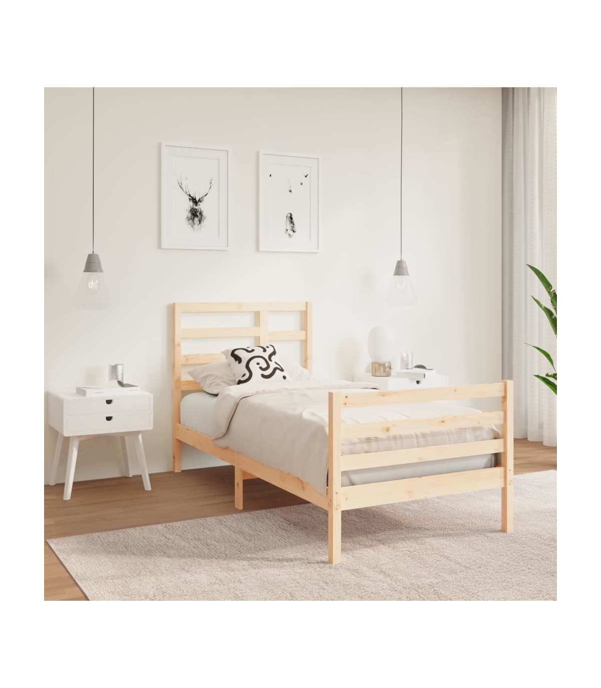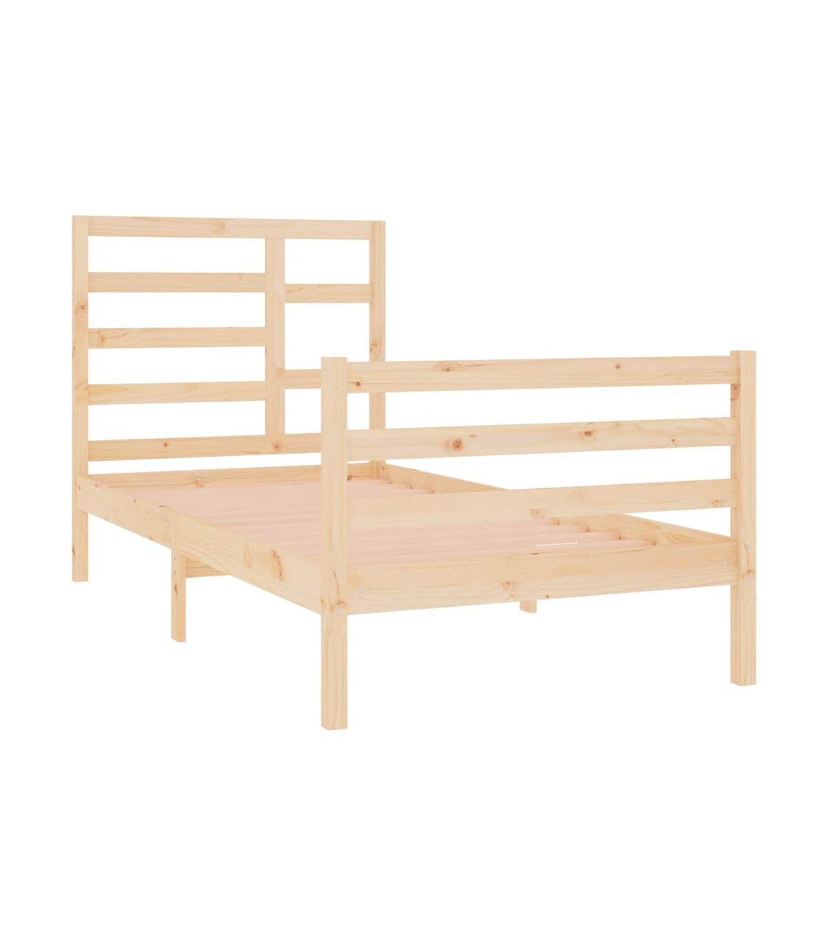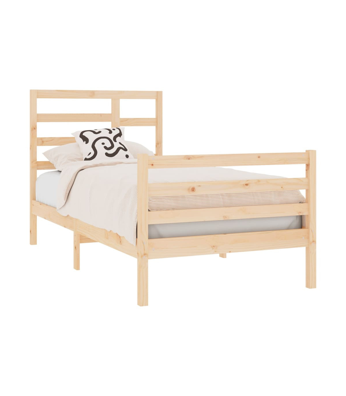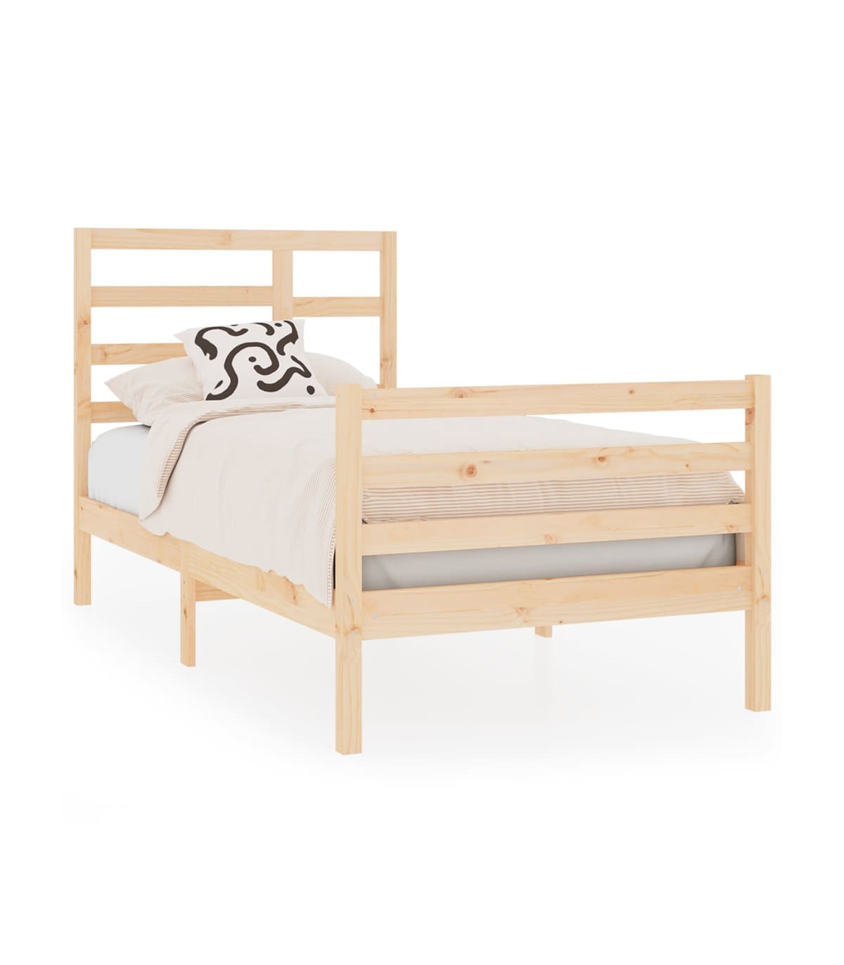 Take the modern route to your bedroom with this wooden bed frame! It makes a practical and decorative addition to your interior. Premium solid wood: Solid pine wood is a beautiful natural material. Pine wood has a straight grain, and the knots give the material its signature, rustic look.Sturdy bed frame: The wooden frame ensures sturdiness and stability. The plywood slats provide good weight distribution, ensuring that the mattress stays in place with every twist and turn of your body during sleep.Eye-catching design: The headboard and footboard design is both decorative and practical. It adds a unique style and comfort.Suitable condition: This single bed is a great solution for small spaces, multi-functional rooms, single sleepers and older children. Whatever your needs or decor plans are, the single bed meets all your needs! Good to know:The delivery includes a bed frame only. The mattress is not included. You can check our shop for the matching mattresses.Some headboard parts are packaged in the bed frame cartons due to space limitations.This bed frame is suitable for a mattress measuring 75 x 190 cm (2FT6 Small Single).