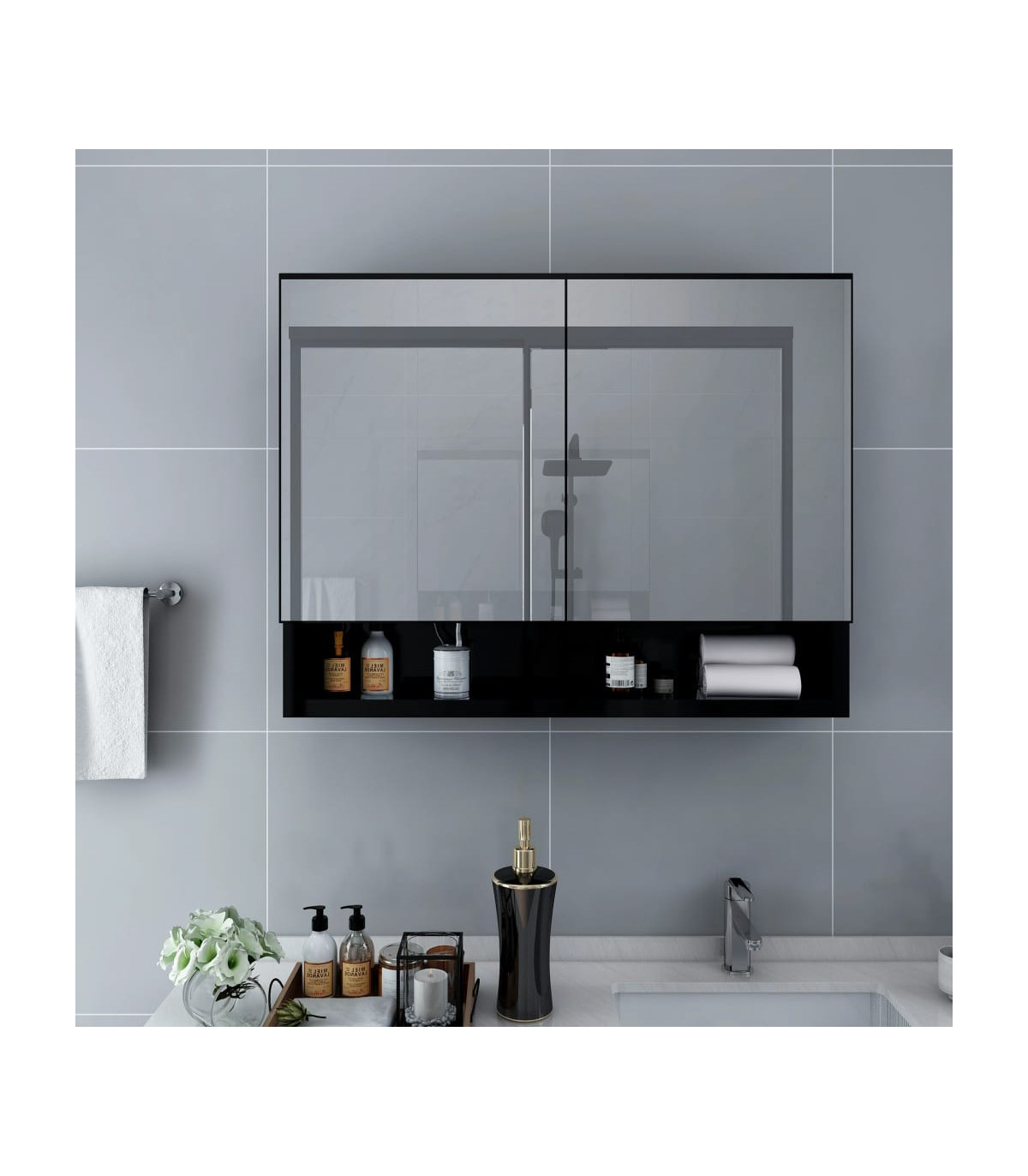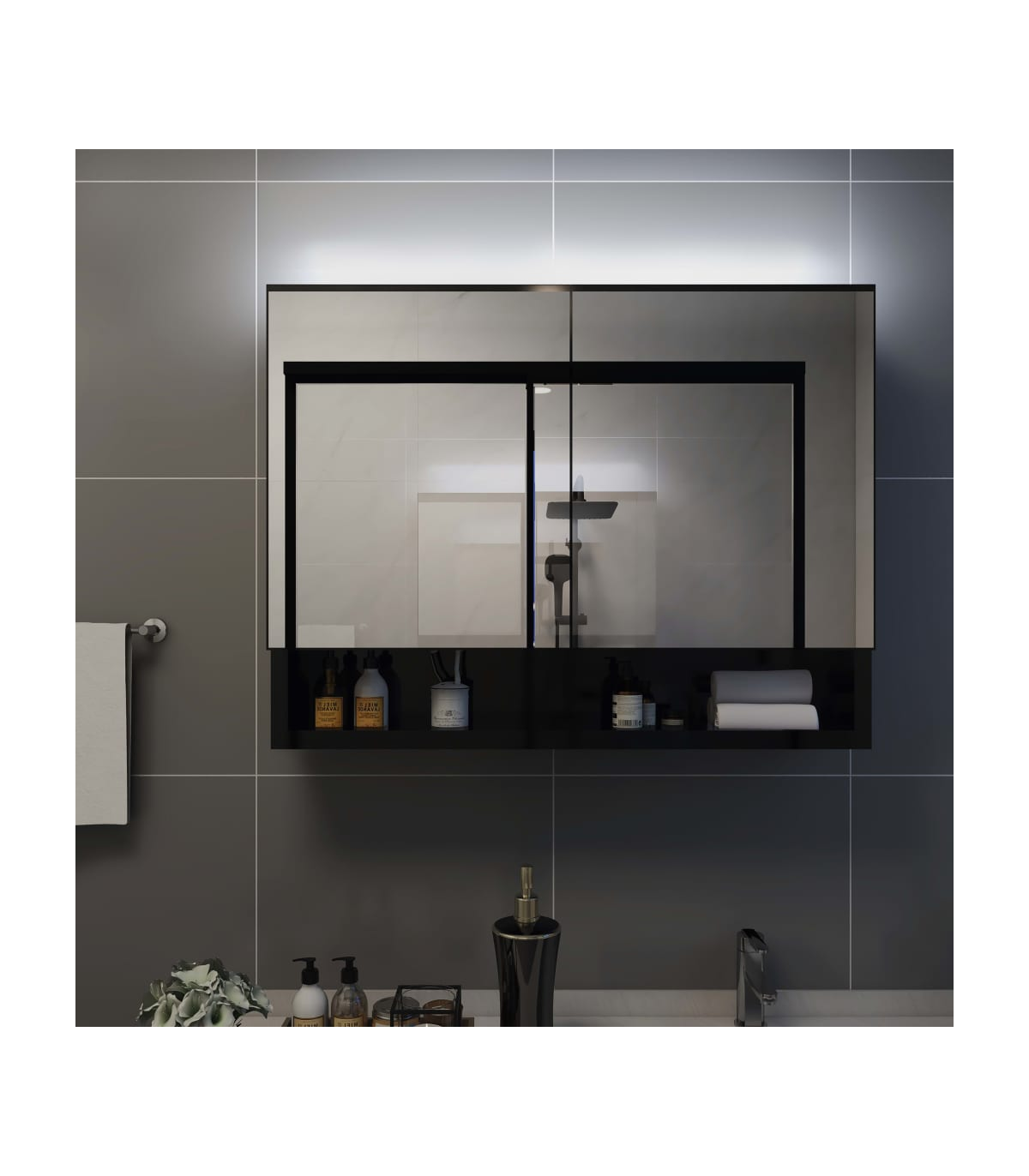 Add an aesthetic and pleasant appearance to your bathroom with this LED vanity mirror cabinet! The wall mirrored cabinet with LED adds a touch of contemporary style and soft illuminating light to any room! The cabinet is made of quality MDF board with the melamine surface, ensuring long-term use. You can easily switch on/off the light with the button. With an energy-efficient LED strip, you can see yourself in the truest light for makeup application, grooming and skincare. The 2 doors and 3 shelves inside the cabinet offer ample storage space. They can easily accommodate your essential toiletries and bath items such as soaps, shampoo, toothpaste, etc. There is a movable partition in the middle of the cabinet. You can install it according to your actual need. Additionally, it is easy to clean with a damp cloth. Stylish and functional, this cabinet will surely make your room decor original and exceptional! Note: The product has a USB connector, but the certified 5V USB power source is not included.