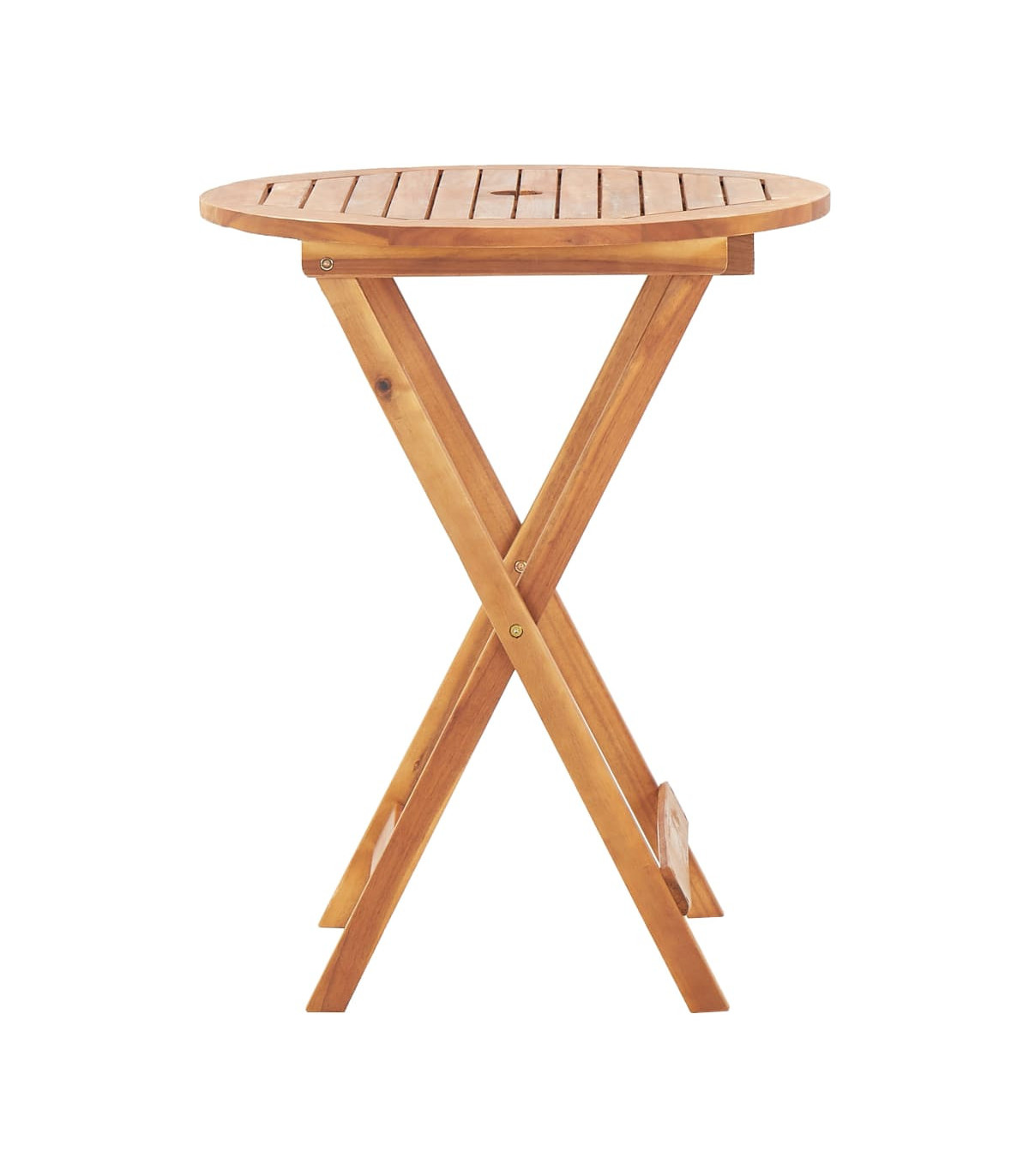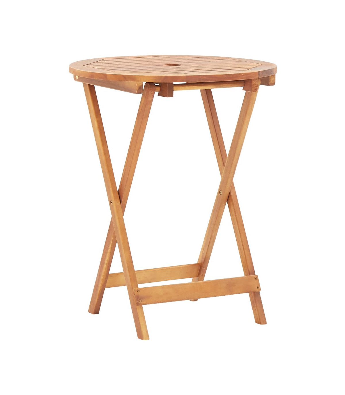 Enjoy a nice meal outdoors with your family and friends around our garden table! The wooden table will bring a touch of rustic charm to your patio, garden or terrace. The outdoor dining table is made of solid acacia wood, a tropical hardwood, which is weather-resistant and highly durable. It features a hole for holding a parasol firmly in the middle. The bistro table can be folded away to save space when not in use. The dining table needs assembly.