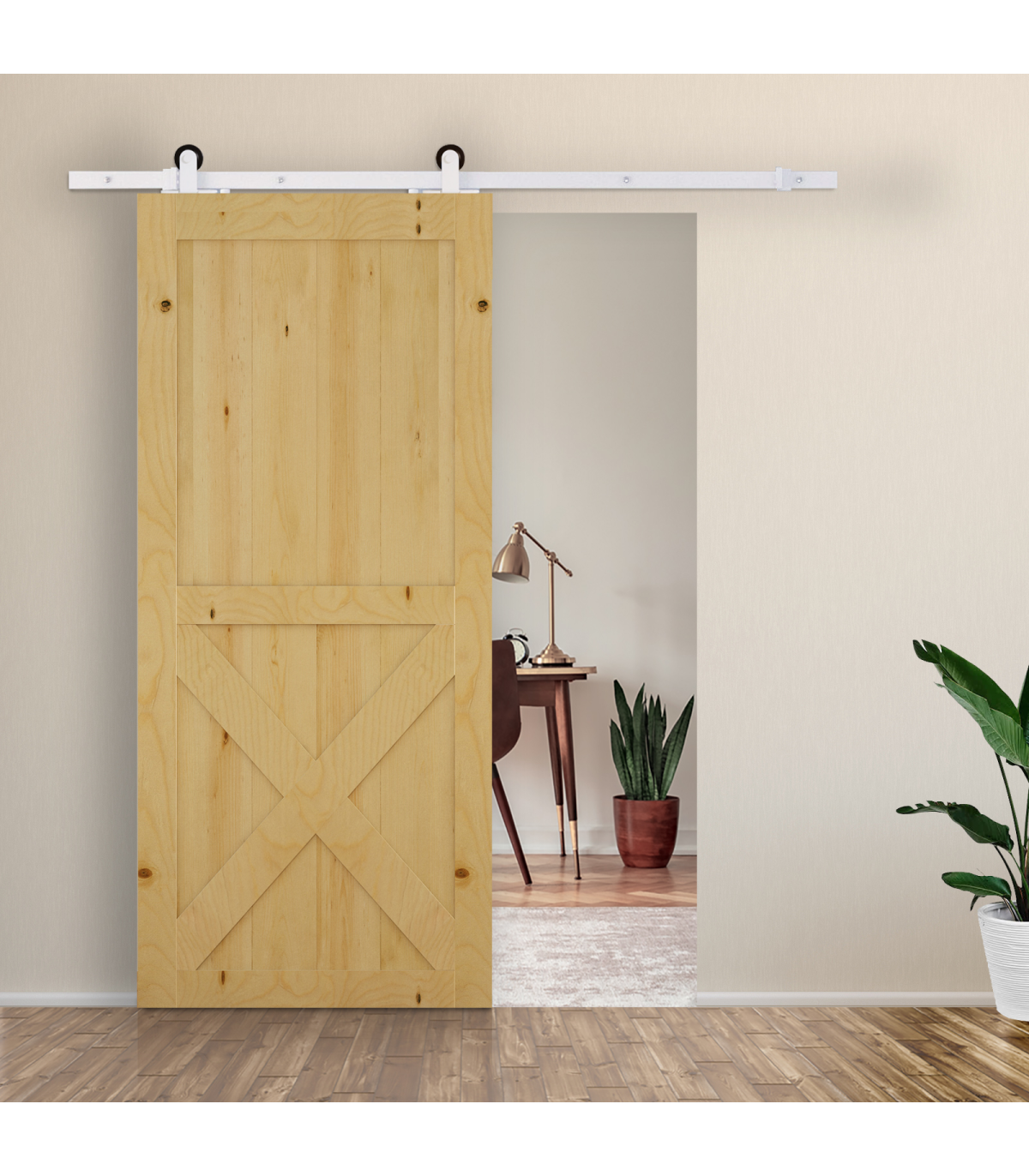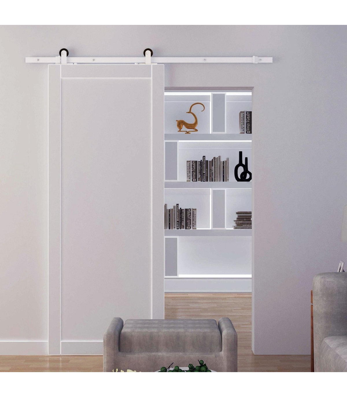 Save space with a door that slides along the wall and requires no swing room