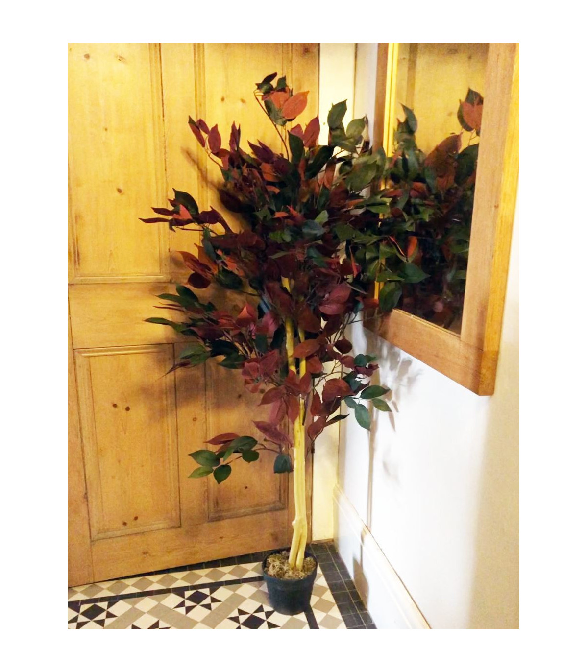 Extra large 120cm (4ft) artificial Red Green Capensia style tree.. Red and Green Foliage with a real wood trunk with a strong durable yellow finish as shown. Whilst this is a fake plant it does look quite realistic- especially if you arrange the wired stems and dress the plant out as we have done. Long-lasting and durable this is a great value artificial plant. The weighted plastic pot measures 16cm (d) x 13cm (h) approx.