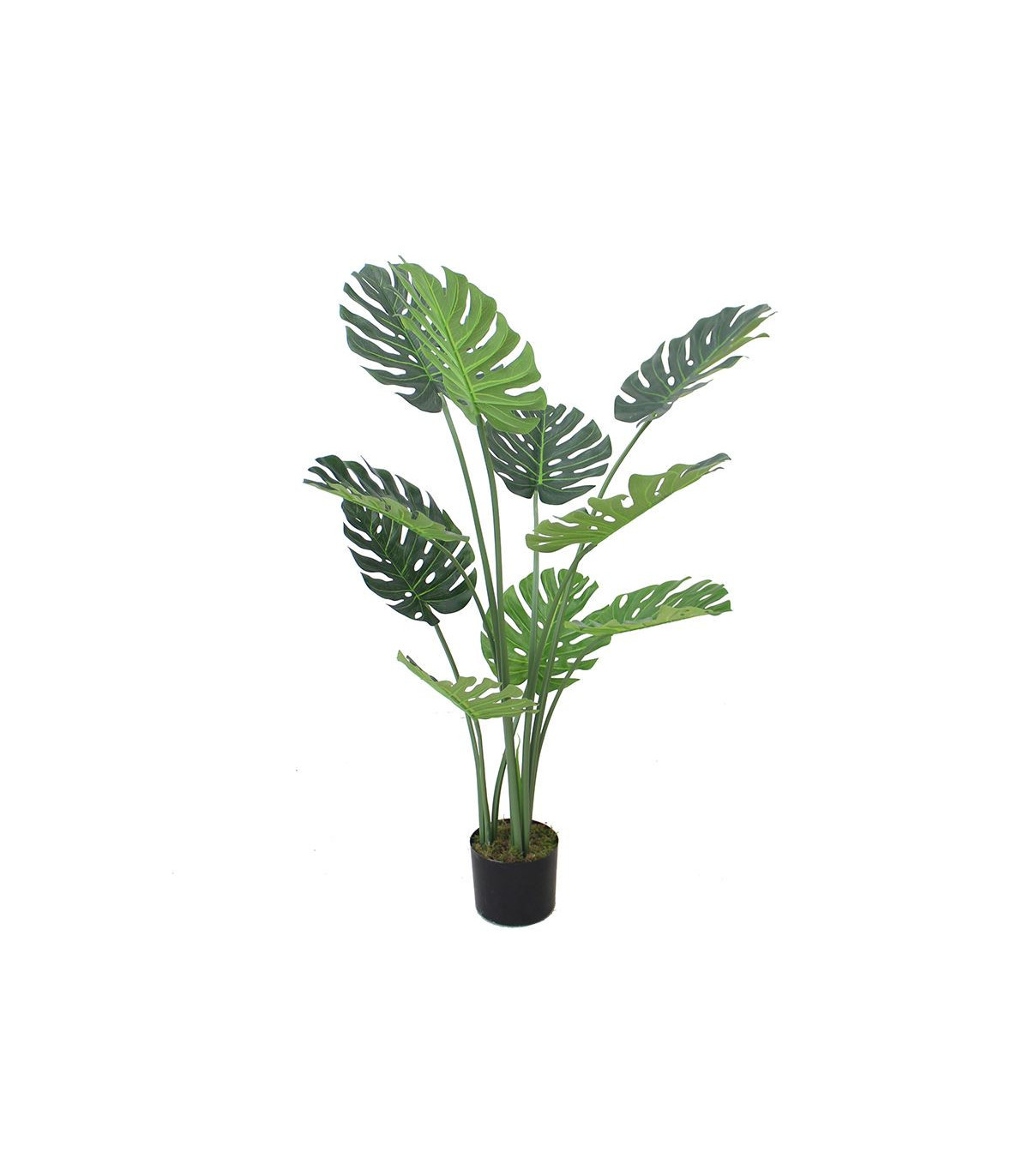 Realistic Monstera plant - 120cm This particular plant is 120cm high. These artificial trees are available in a range of heights. They come potted in plastic black pots and are ready to display - just arrange the stems as you wish. It is also very simple to put into a larger planter - just pop inside and cover with gravel or bark.
