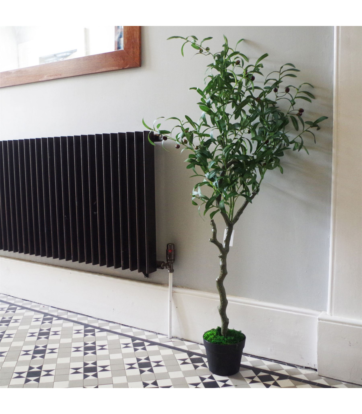 120cm natural design Artificial Olive Tree with pot. Plant measures 120cm (h) x 40cm x 30cm as we have it arranged in our photos. The stems are wired and so this can be adjusted to fit your space perfectly. This also has highly realistic olives (please exercise caution when using in homes with small children as these do actually look edible). Comes fully potted in a moss covered weighted plastic pot which can either be left as it is or placed inside a decorative planter. These plants look particularly impressive if they are put inside a larger planter and covered with bark- gravel or soil to add to the realistic effect- any metal planters pictured are for illustration only and are not included. Plastic pot the tree comes in measures 16cm (d) x 13cm (h) approx.