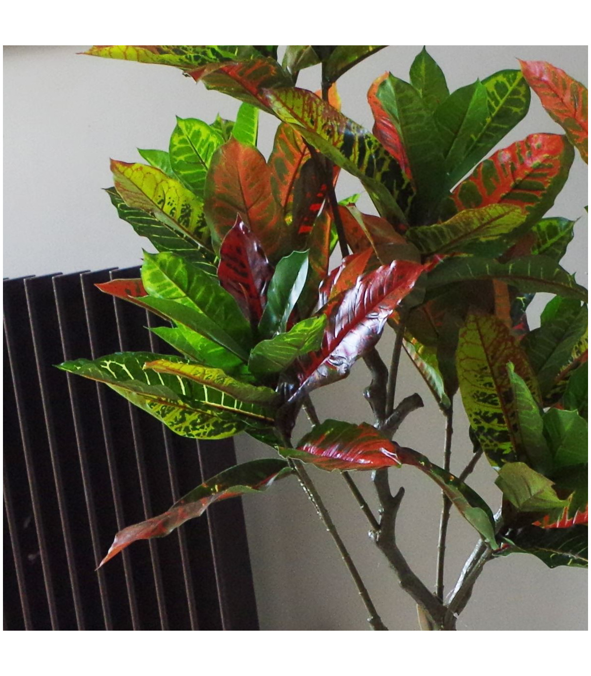 130cm Artificial Tree Codiaeum Variegatum (also known as Variegated Croton- Garden Croton and Joseph's Coat) is a plant native to Australia and Indonesia. With its beautiful variegated leaves it is easy to see why this is a popular houseplant. Real Codiaeum Variegatum plants are not only poisonous but are also extremely tricky to grow and maintain indoors making an artificial Codiaeum Variegatum plant the ideal alternative! This artificial plant stands 130cm high x 60cm x 60cm when arranged as shown in the pictures. The width will vary depending on how you arrange the leaves. Our artificial version is extremely realistic and totally safe (real Codiaeum is both poisonous and irritant!) The stems are wired and can be rearranged to suit your requirements. It comes potted in a plastic pot and is ready to display - just arrange the stems as you wish. Plastic pot measures 16cm (d) x 13cm (h) approx. Looks fantastic in our metal planters (available separately)- any metal planters pictured are for illustration only and are not included. Plastic pot the tree comes in measures 16cm (w) x 13cm (h).