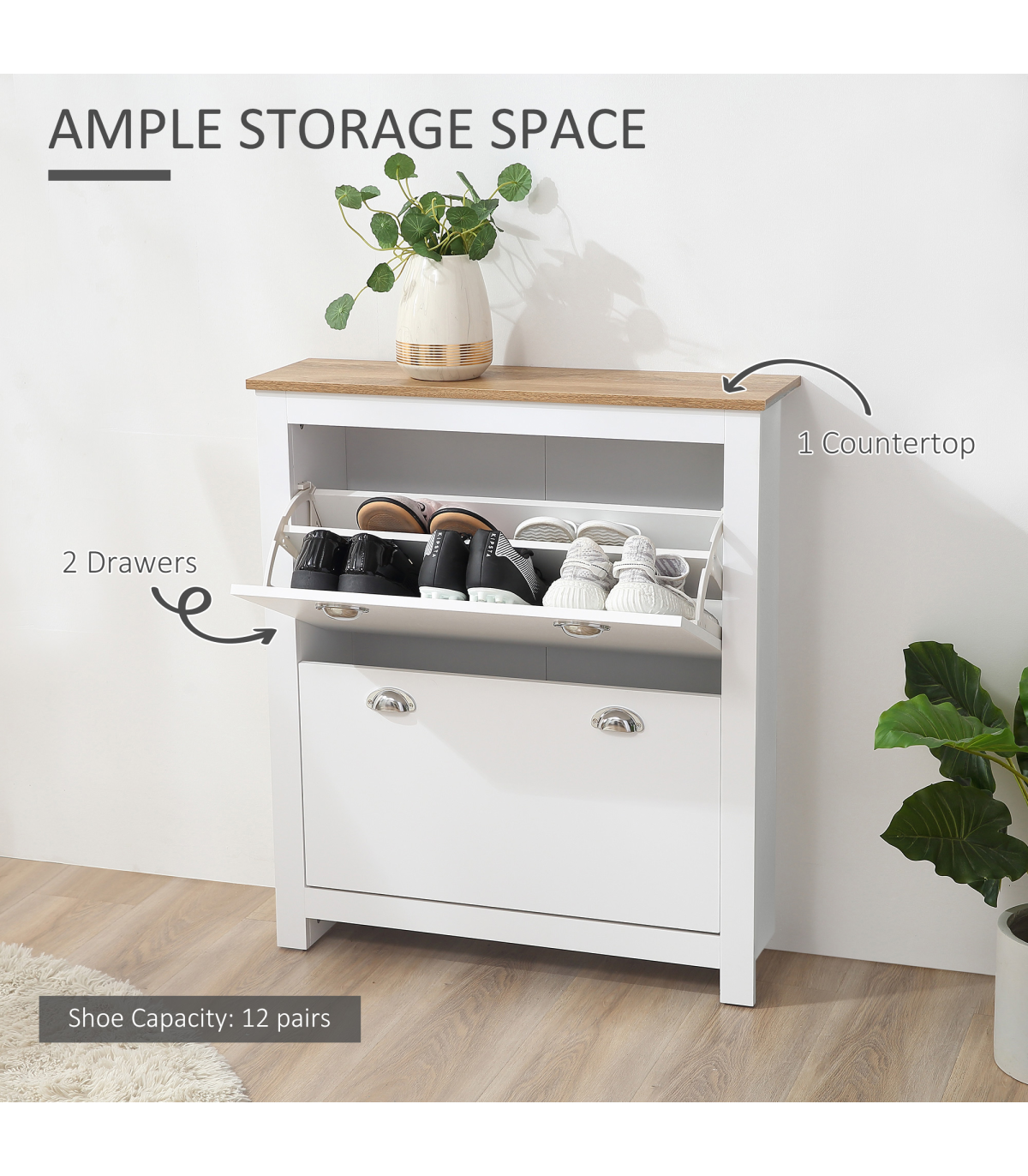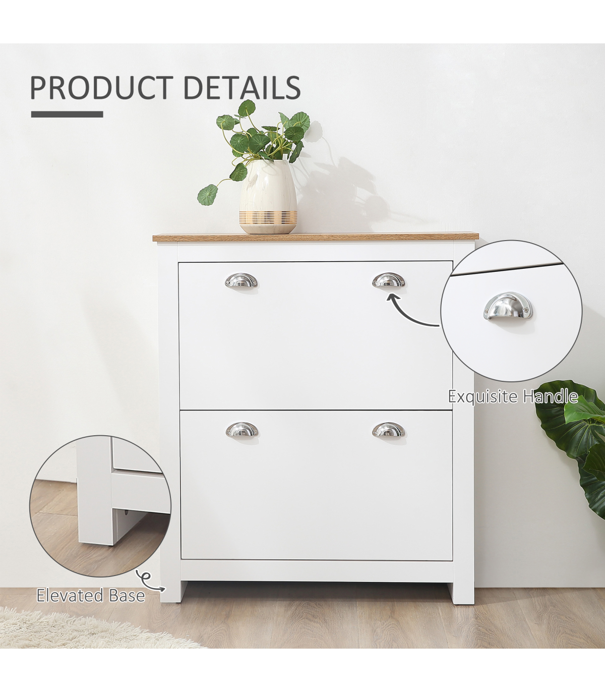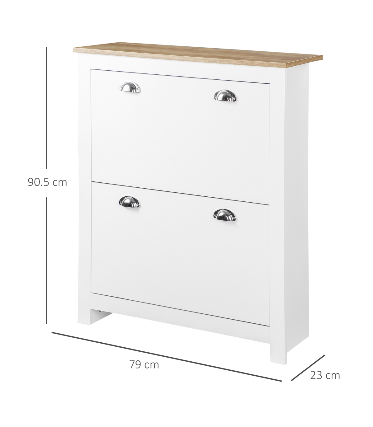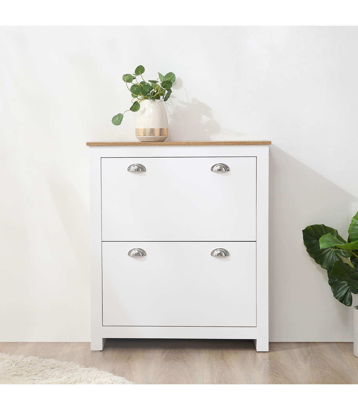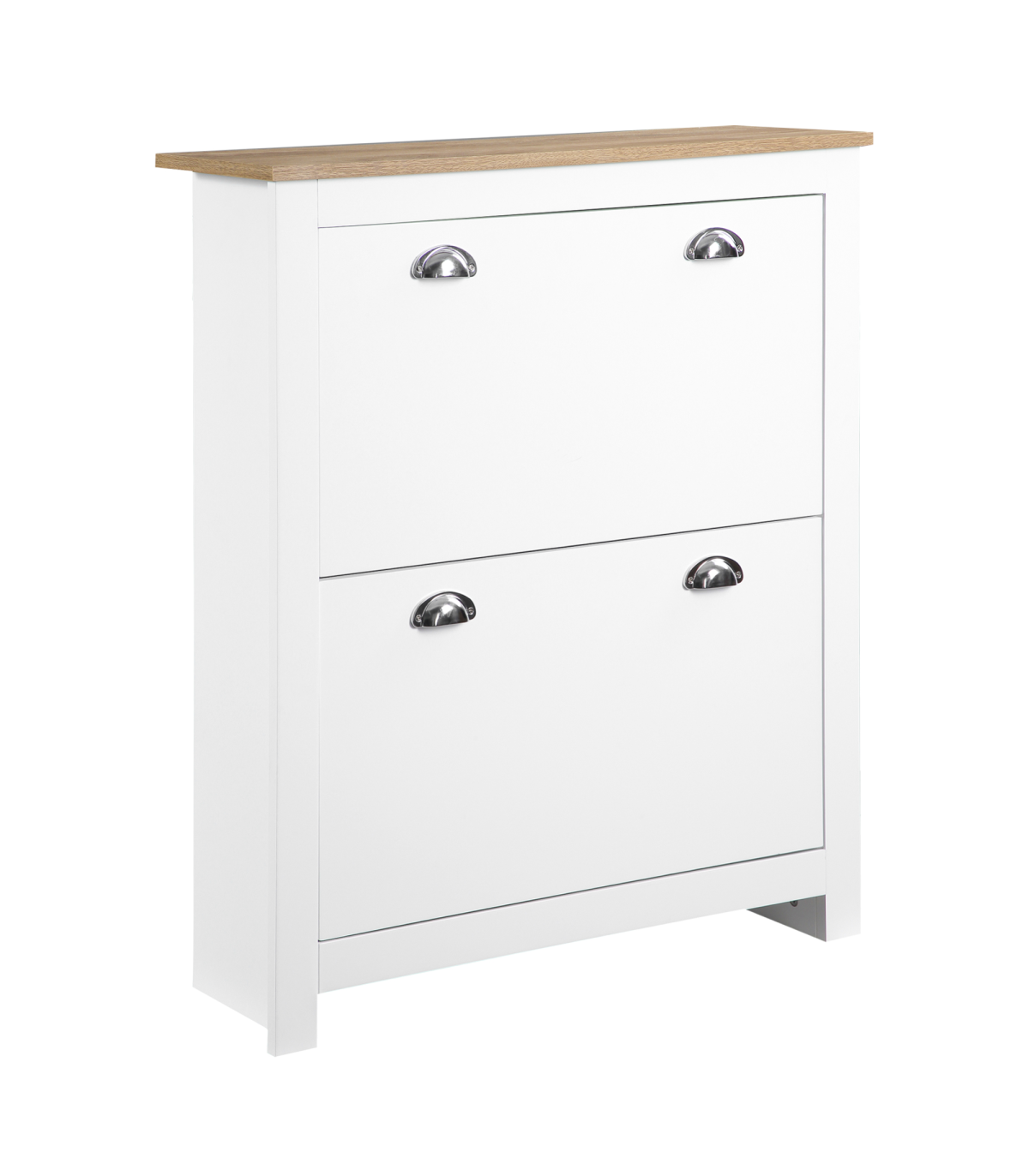 HOLDS 12 SHOE PAIRS: Two drawers, each can hold six - perfect for keeping your hallway/front entrance neat and tidy. Adjustable shelves in each drawer for flexible storage.FLAT TOP: Beautiful wood effect complements the modern white finish. Extra holding room - great for keys, decorations and more.STURDY: MDF structure is durable, suitable for everyday use. Foot pads to protect floor. Safe anti-tipping design so cabinet doesn't fall forwards.DIMENSIONS: 90.5H x 79L x 23Wcm. Compartment: 36H x 66W x 9.5Dcm. Compartment two: 36H x 66W x 8.5Dcm.MAXIMUM LOAD: Whole: 10kg. Drawer: 5kg. ASSEMBLY REQUIRED.